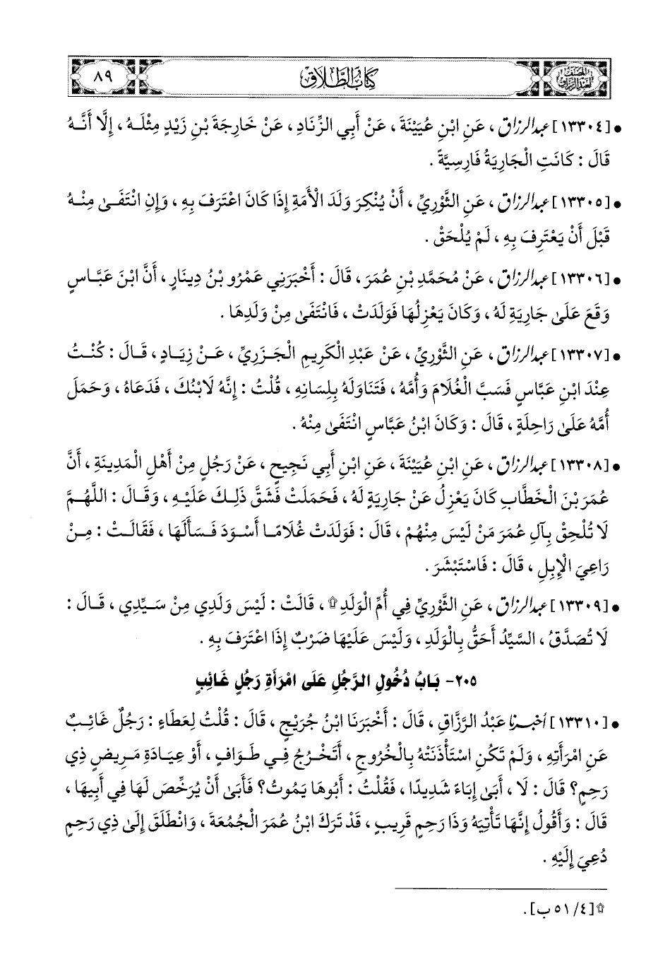13308- عبد الرزاق، عَنِ ابْنِ عُيَيْنَةَ، عَنِ ابْنِ أَبِي نَجِيحٍ، عَن رَجُلٍ مِنْ أَهْلِ المَدِينَةِ، أَنَّ عُمَرَ بن الْخَطَّابِ كَانَ يَعْزِلُ عَن جَارِيَةٍ لَهُ، فَحَمَلَتْ، فَشَقَّ ذَلِكَ عَلَيْهِ، وَقَالَ: اللهُمَّ لاَ تُلْحِقْ بِآلِ عُمَرَ مَنْ لَيْسَ مِنْهُمْ، قَالَ: فَوَلَدَتْ غُلاَمًا أَسْوَدَ فَسَأَلَهَا، فَقَالَتْ: مِنْ رَاعِي الإِبِلِ. قَالَ: فَاسْتَبْشَرَ.