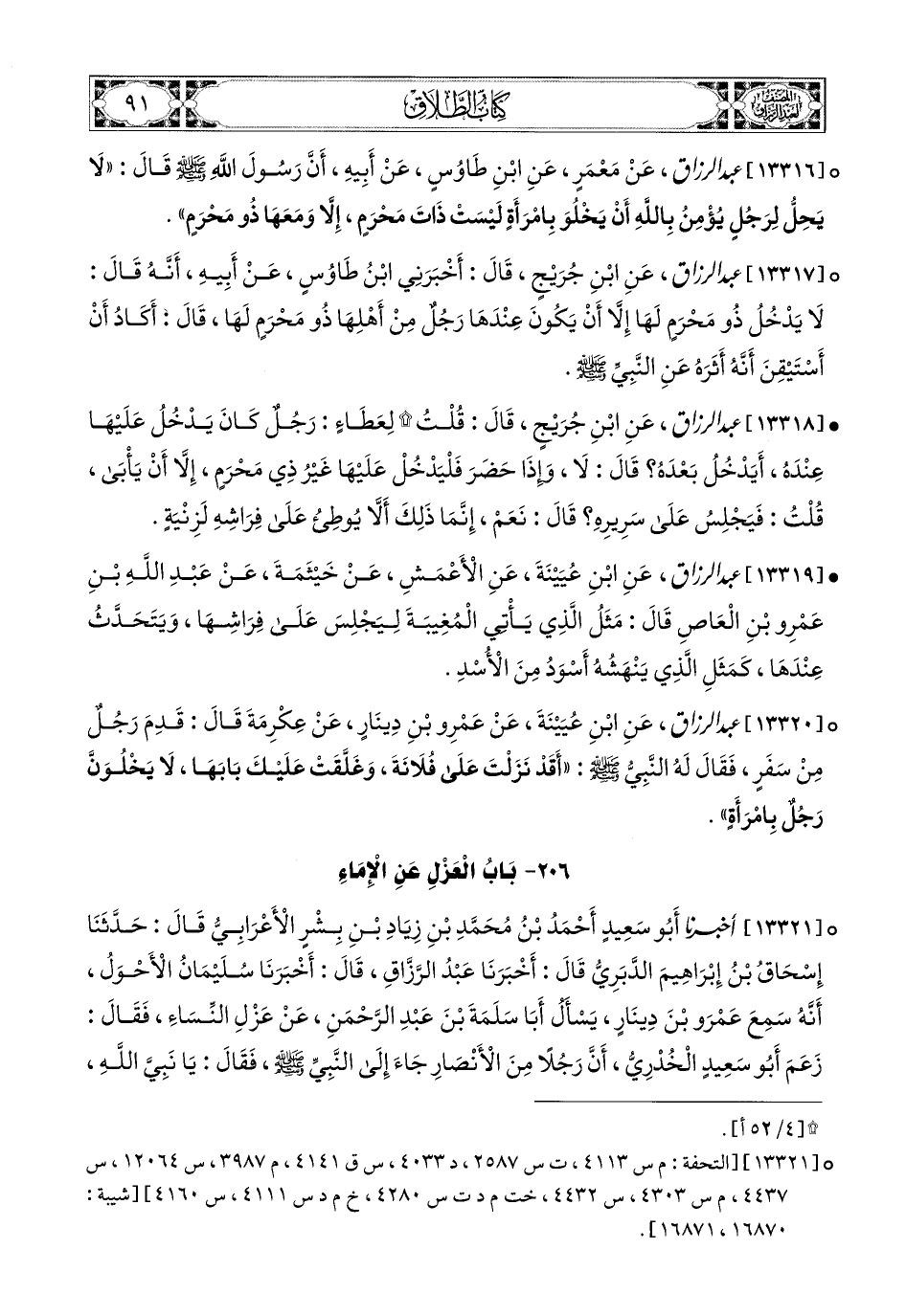 13316- عبد الرزاق، عَنْ مَعْمَرٍ، عَنِ ابْنِ طَاوُوسٍ، عَنْ أَبِيهِ، أَنَّ رَسُولَ اللهِ صَلَّى اللهُ عَلَيْهِ وَسَلَّمَ قَالَ: لاَ يَحِلُّ لِرَجُلٍ يُؤْمِنُ باللهِ أَنْ يَخْلُو بِامْرَأَةٍ لَيْسَتْ ذَاتَ مَحَرَّمٍ، إِلاَّ وَمَعَهَا ذُو مَحَرَّمٍ.