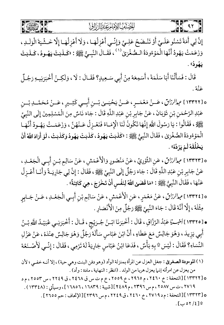 13322- عبد الرزاق، عَنْ مَعْمَرٍ، عَن يَحيَى بنِ أَبِي كَثِيرٍ، عَن مُحَمَّدِ بْنِ عَبدِ الرَّحْمَنِ بْنِ ثَوْبَانَ، عَن جَابِرِ بْنِ عَبدِ اللهِ، قَالَ: جَاءَ نَاسٌ مِنَ المُسْلِمِينَ إِلَى النَّبِيِّ صَلَّى اللهُ عَلَيْهِ وَسَلَّمَ فَقَالُوا: يَا رَسُولَ اللهِ، إِنَّهَا تَكُونُ لَنَا الإِمَاءُ، فَنَعْزِلُ عَنْهُنَّ، وَزَعَمَتْ يَهُودُ أَنَّهَا المَوْؤُودَةُ الصُّغْرَى. فَقَالَ النَّبِيُّ صَلَّى اللهُ عَلَيْهِ وَسَلَّمَ: كَذَبَتْ يَهُودُ، كَذَبَتْ يَهُودُ وَكَذَبَتْ، لَوْ أَرَادَ اللهُ أَنْ يَخْلُقَهُ لَمْ يَرُدَّهُ.