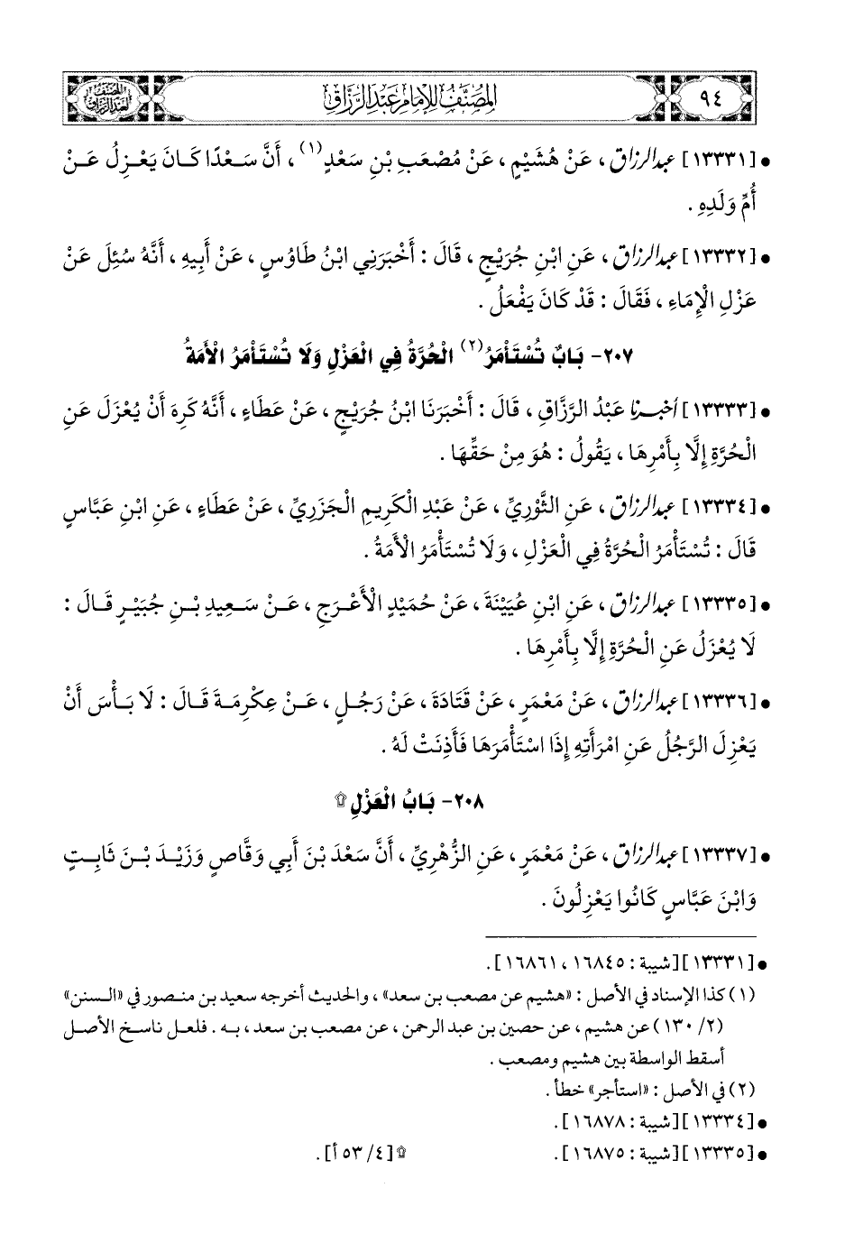 - [أَخْبَرَنَا الثَّورِيّ، عَنْ مَنصُورٍ، عَن إِبرَاهِيمَ، قَالَ: تُسْتَأْمَرُ الْحُرَّةُ فِي الْعَزْلِ، وَلاَ تُسْتَأْمَرُ الأَمَةُ] (1).