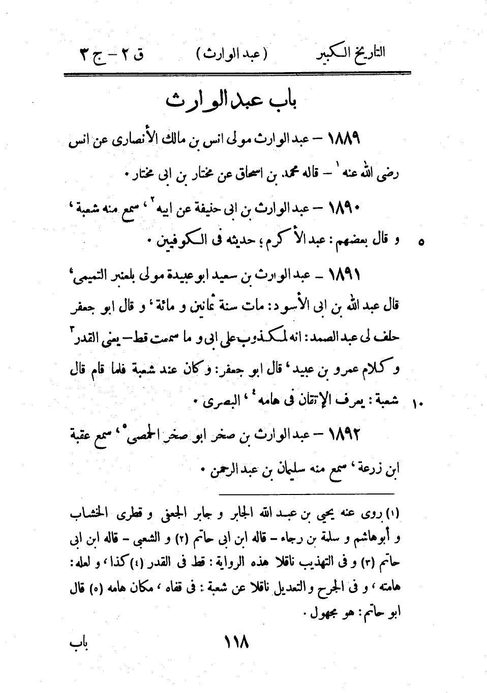 (1) ذكره ابن حبان في ج 4 من ثقاته (2) وكان في الاصل: وهبان، والصواب: اهبان، كما هو في الجرح والتعديل والتعجيل (3) ومعتمر بن سليمان - قاله في الجرح والتعديل والتعجيل (4) قال ابن ابى حاتم: روى عن مسعر وسفيان الثوري ومالك بن انس وعبد الحميد بن جعفر وبكير بن مسمار روى عنه احمد بن حنبل ومحمد بن بشار ومحمد بن المثنى (5) وكان في الاصل: عبد الكريم، خطأ، راجع الكتب، على ان عبد الكريم لا يذكر في عبد الكبير، فهو من سهو الناسخ.