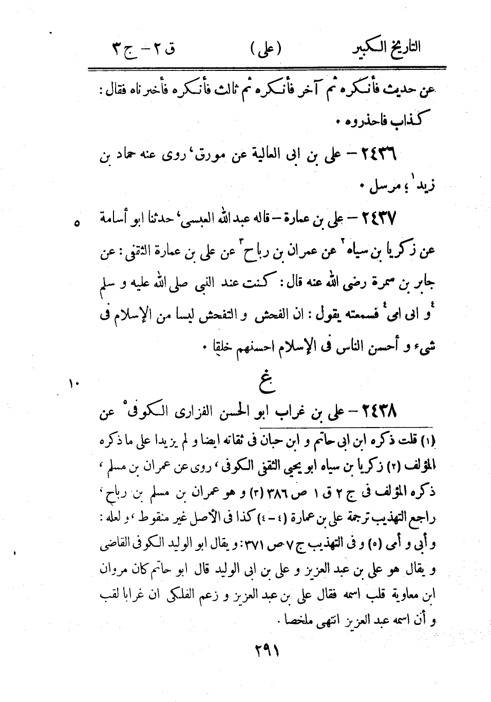 2463 - عَلِيّ بْن نصر بْن عَلِيّ الْأَزْدِيّ الجهضمي الْبَصْرِيّ 2، قَالَ نصر بْن عَلِيّ: مات سنة سبع وثمانين ومائة فِي آخر إمرة أَبِي جَعْفَر، كنيته أَبُو الْحَسَن، سَمِعَ سلام بْن أَبِي مطيع وشُعْبَة.