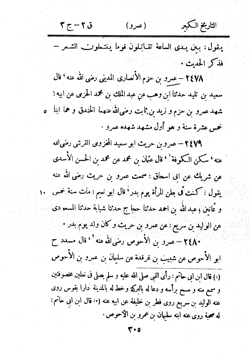 2497 - عَمْرو بْن سلمة أَبُو يزيد الجرمي، روى عَنْهُ أَبُو قلابة وأيوب، أدرك زمان النَّبِيّ صَلَّى اللَّهُ عَلَيْهِ وَسَلَّمَ 1، نزل البصرة.