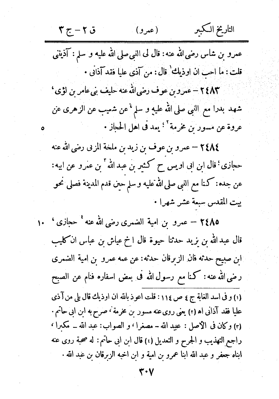 2504 - عَمْرو بْن الأَسْوَدِ الْعَنْسِيّ أَبُو عَبْد الرَّحْمَن 3، يعد فِي الشاميين، سَمِعَ مُعَاوِيَة، روى عَنْهُ خَالِد بْن مَعْدَان، قَالَ نعيم بْن حماد عَنِ ابْن وهب عَنْ مُعَاوِيَة عَنْ يُونُسَ بْن سَيْفٍ: عَنْ عَمْرو بْن الأَسْوَدِ الْعَنْسِيّ: سَمِعَ عُمَر رَضِيَ اللَّهُ عَنْهُ يَقُولُ: عليكم بالحج، يعد فِي الشاميين 4، وَرَوَى خَالِد: عَنْ عَمْرو بْن الأَسْوَدِ سَمِعَ جنادة، كناه أَحْمَد، مُحَمَّد بْن عَبْد اللَّه حَدَّثَنَا ربيع بْن روح حَدَّثَنَا أَبُو حيوة شريح بْن يزيد الحضرمي عَنْ أرطاة: عَنْ عَمْرو بْن الأَسْوَدِ الْعَنْسِيّ: أَنَّهُ انطلق إلى العراق فيقولون