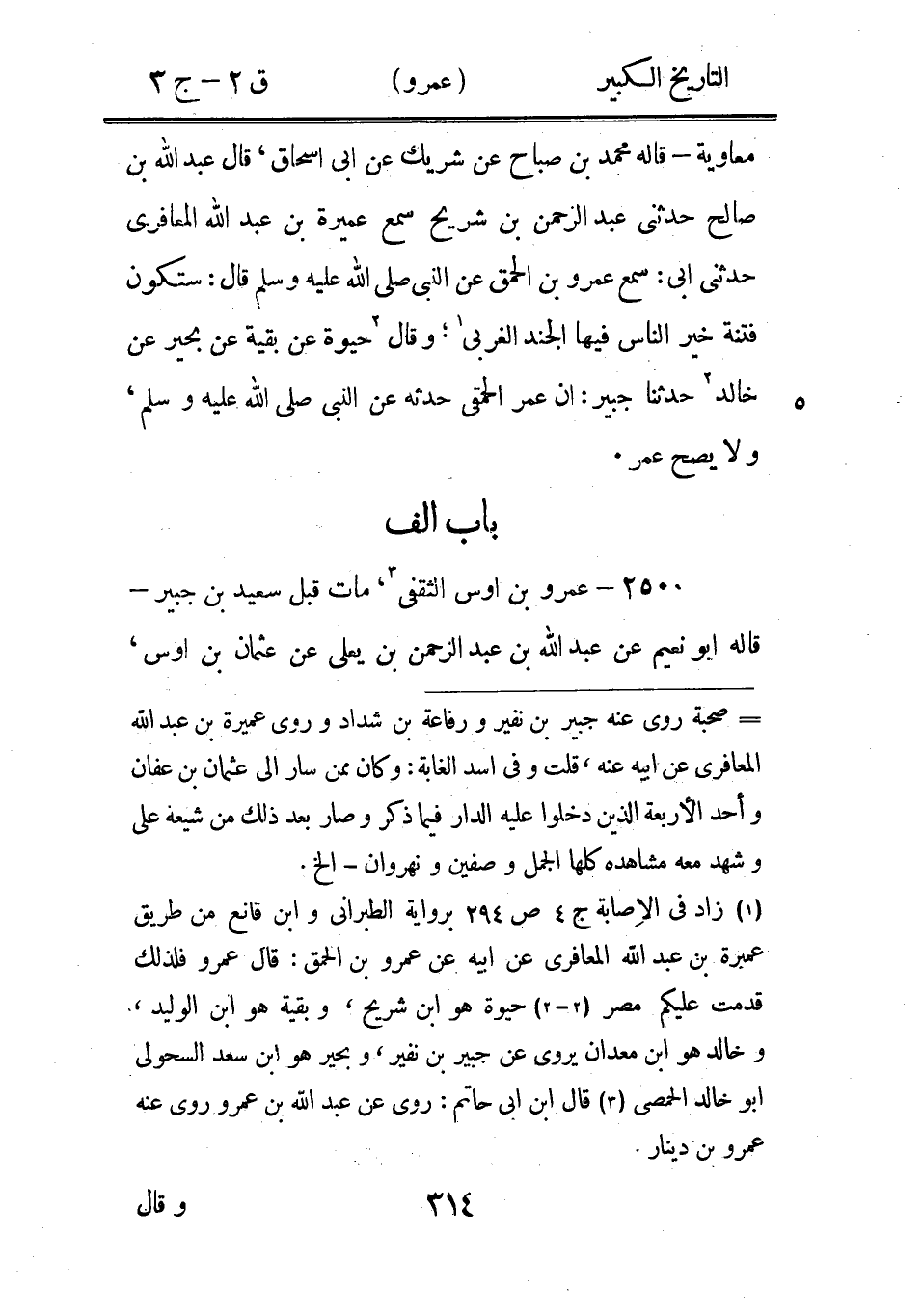 2527 - عَمْرو بْن حريش أَبُو مُحَمَّد الزبيدي، سَمِعَ عَبْد اللَّه بْن عَمْرو - قَالَه سَعِيد بْنُ مُحَمَّدٍ عَنْ يَعْقُوبَ بْنِ إِبْرَاهِيمَ عَنْ أَبِيهِ: عَنِ ابْن إِسْحَاق حَدَّثَنِي 4 سُفْيَان بْن جُبَيْر 4 مولى ثقف الحرشى - وكان ثقة - عن