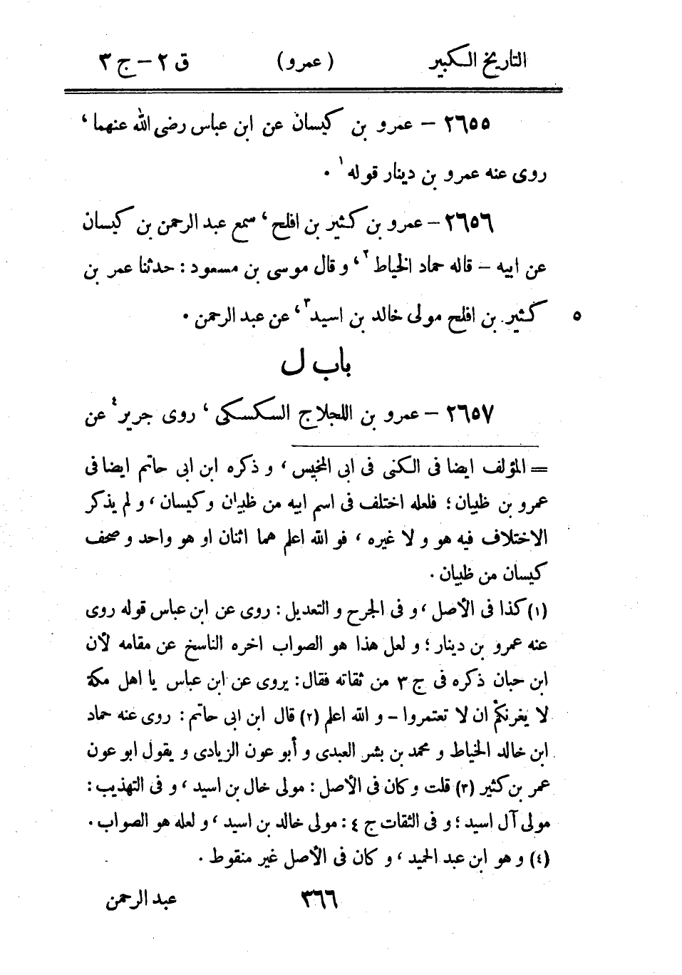 1 - 1) كذا في الاصل، ولعل الصواب: ثلاث للميت بعد موته، فصحف أو هو: بعد موتك، فصحف - والله اعلم (2) قلت وكان في الاصل هنا على الهامش: عمرو بن مرزوق أبو العنبس، اظن هو من اوهام الناسخ اوهو عنوان كان في الاصل فظنه الناسخ من تروك الاصل بل هو: عمرو بن مروان، يأتي بعد، أو هو: عمرو بن محمد بن مرزوق مولى لبنى شيبان أبو عثمان الرقى نزيل البصرة روى عن ابى اسحاق الفزارى روى عنه أبو حاتم وأبو زرعة، راجع الجرح والتعديل - والله اعلم (3) وفى الجرح والتعديل: والعنقز شئ ينسب إليه، وفى الباب: العنقزى بفتح العين وسكون النون وفتح القاف وفى آخرها زاى هذه النسبة إلى العنقز وهو المرزنجوش وقيل الريحان وهو الشاه اسفرم ينسب إليه أبو سعيد عمرو بن محمد العنقزى القرشى مولاهم من اهل الكوفة كان يبيع العنقز أو يزرعه مات سنة تسع وتسعين ومائة وكان ثقة يروى عن اسرائيل والثوري روى عنه ابنه الحسين اه، قلت وفى تذكرة