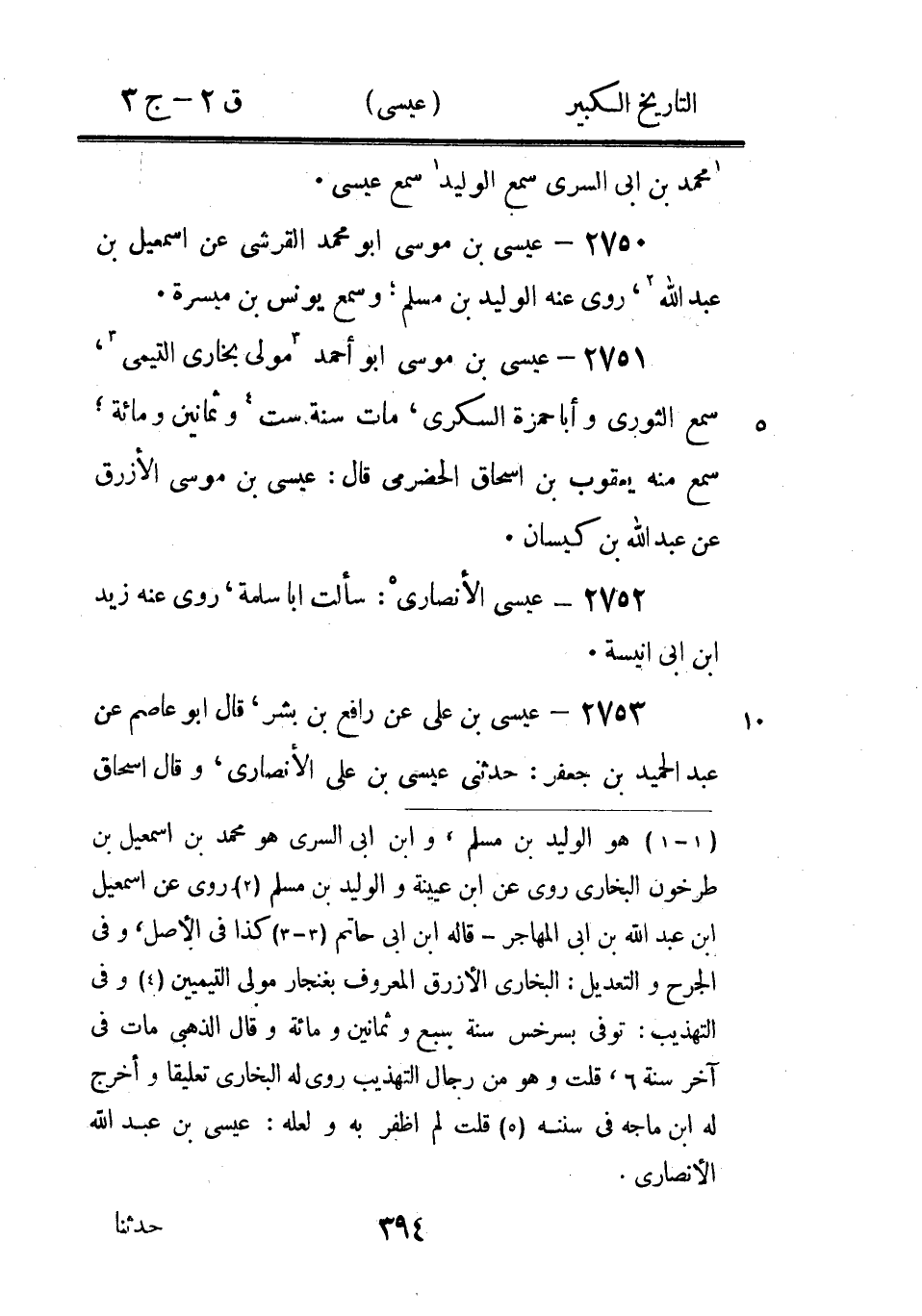 2784 - عِيسَى بْن سُلَيْمَان بْن دينار أَبُو طيبة الدارمي الجرجاني، سَمِعَ جَعْفَر بْن مُحَمَّد 3، مات سنة ثلاث وخمسين ومائة ومات ابنه