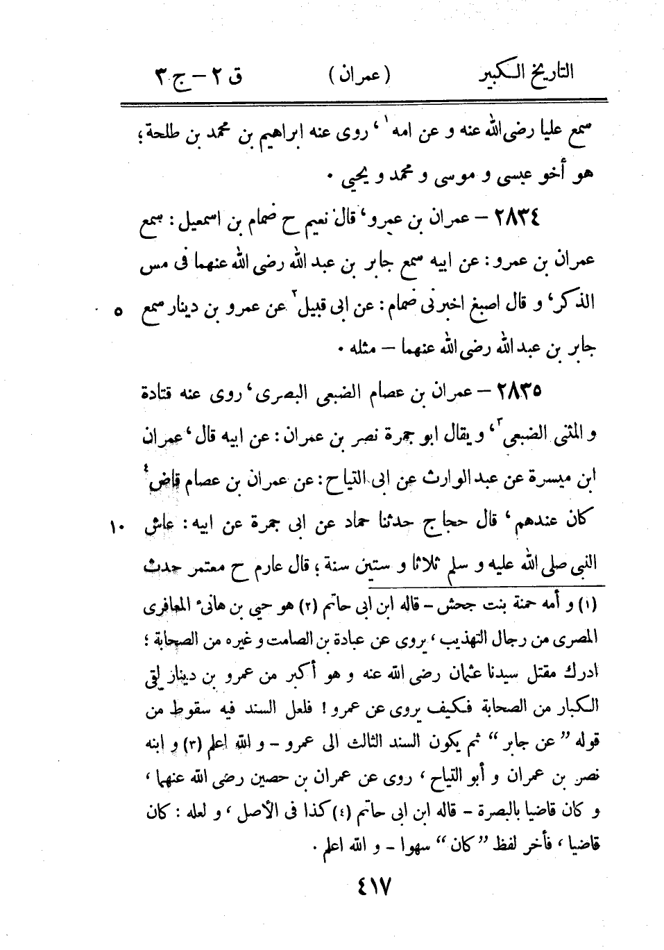 2869 - عِمْرَان بْن عُبَيْد الْمَكِّيّ عَنْ أمه ليلى مولاة 6 أسماء وعبد اللَّه بْن كيسان عَنْ أسماء قولها، روى عنه أبو عاصم 7.
