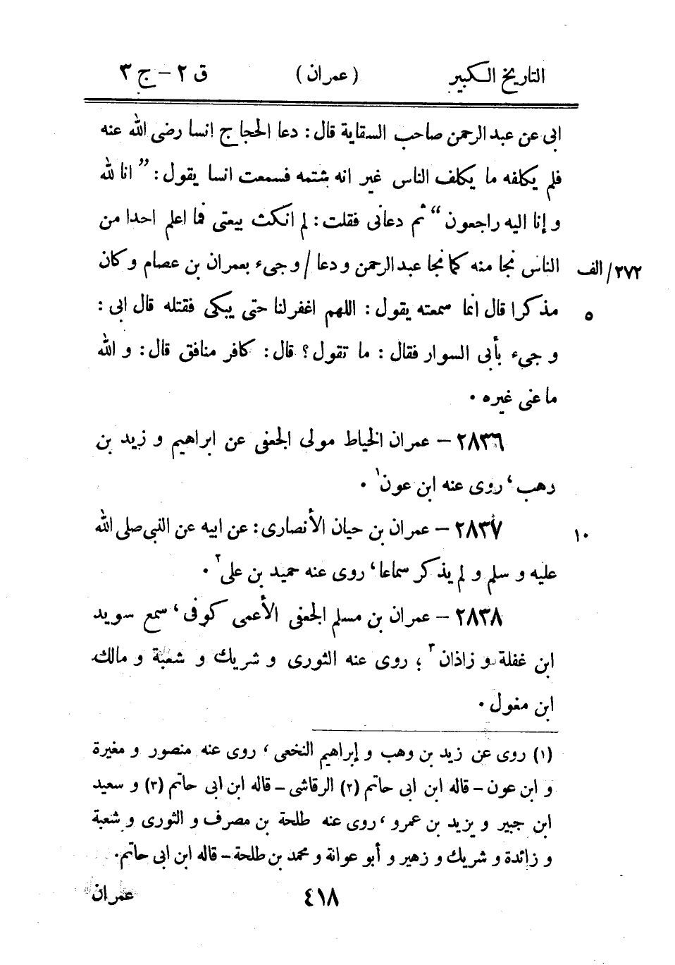 2870 - عِمْرَان بْن سُلَيْمَان المرادي، سَمِعَ الشَّعْبِيّ 1، روى عَنْهُ عِيسَى بْن يونس وحفص بْن غياث، قال ابن نمير حدثنا ابن أَبِي خَالِد عَنْ عِمْرَان: عَنِ الشَّعْبِيّ فِي القذف قوله 2 وكَانَ حي فطلبته فلم فِي جهينة أو كندة 2، فِي الْكُوفِيِّينَ.