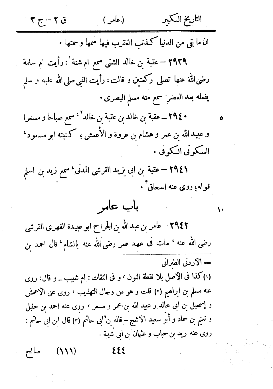 1 - 1) كذا والظاهر انه مكرر (2) وكان في الاصل: عبدة، خطأ، والصواب: عبيدة، راجع الثقات والجرح والتعديل والتهذيب، قال ابن ابى حاتم: عامر بن عبيدة الباهلى بصرى قاضى البصرة روى عن انس وأبى المليح عن ابيه الصلاة في الرحال روى عنه شعبة وأبو أسامة ويزيد بن مغلس (3) روى عنه أبو عثمان النهدي - قاله ابن ابى حاتم (4) قال ابن ابى حاتم: عامر بن زيد البكالى، وقال ابن حبان في ج 2 من ثقاته: روى عنه أبو سلام ويحيى بن ابى كثير (5) عتبة بن عبد أبو الوليد السلمى الشامي له صحبة.