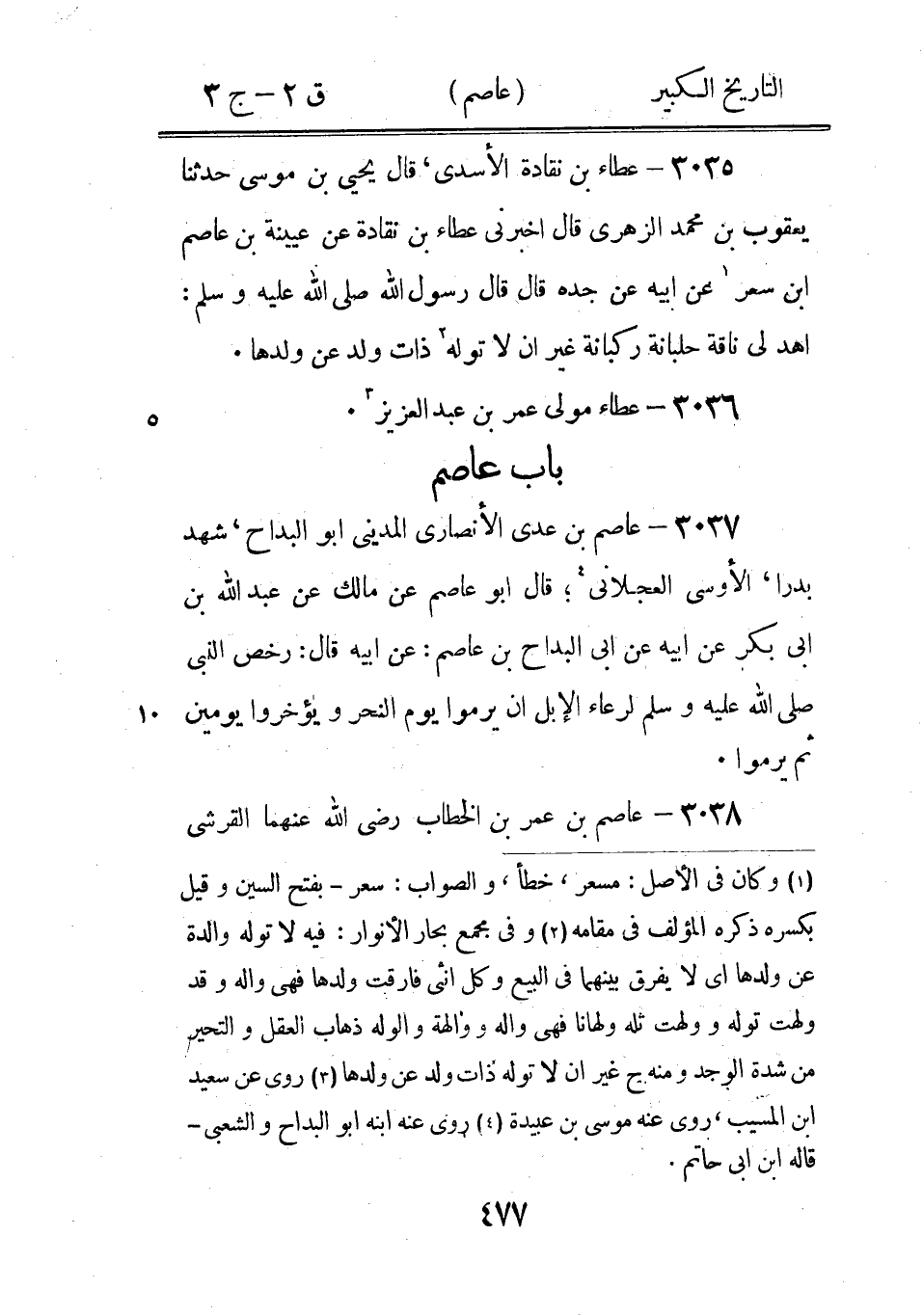 3058 - عاصم بْن سُلَيْمَان أَبُو عَبْد الرَّحْمَن الأحول، سمع انسا رضى الله عَنْهُ وحفصة 1 والْحَسَن وابْن سيرين رَضِيَ اللَّهُ عَنْهُم، سَمِعَ منه الثوري وشُعْبَة، وَرَوَى مُعْتَمِر عَنْ ليث عَنْ عاصم: عَنْ أَبِي المتوكل 2: عن عمر رَضِيَ اللَّهُ عَنْهُ عَنِ النَّبِيِّ صَلَّى اللَّهُ عَلَيْهِ وَسَلَّمَ: إِذَا جامَعَ فأراد العود - أو نحوه، وَقَالَ جرير عَنْ ليث عَنْ عَبْد الرَّحْمَن: عَنْ أَبِي المتوكل 3: عَنْ أَبِي سَعِيد رَضِيَ اللَّهُ عَنْهُ عَنِ النَّبِيِّ صَلَّى اللَّهُ عَلَيْهِ وَسَلَّمَ، وعَنْ عَبْد الرَّحْمَن: عَنْ 4 أَبِي عثمان عَنْ سلمان 4 رضى الله عنه عن عمر رضى الله عَنْهُ، والمَعَروف عَنْ أَبِي المتوكل عَنْ أَبِي سعيد رَضِيَ اللَّهُ عَنْهُ عَنِ النَّبِيِّ صَلَّى اللَّهُ عَلَيْهِ وَسَلَّمَ، وعَنْ