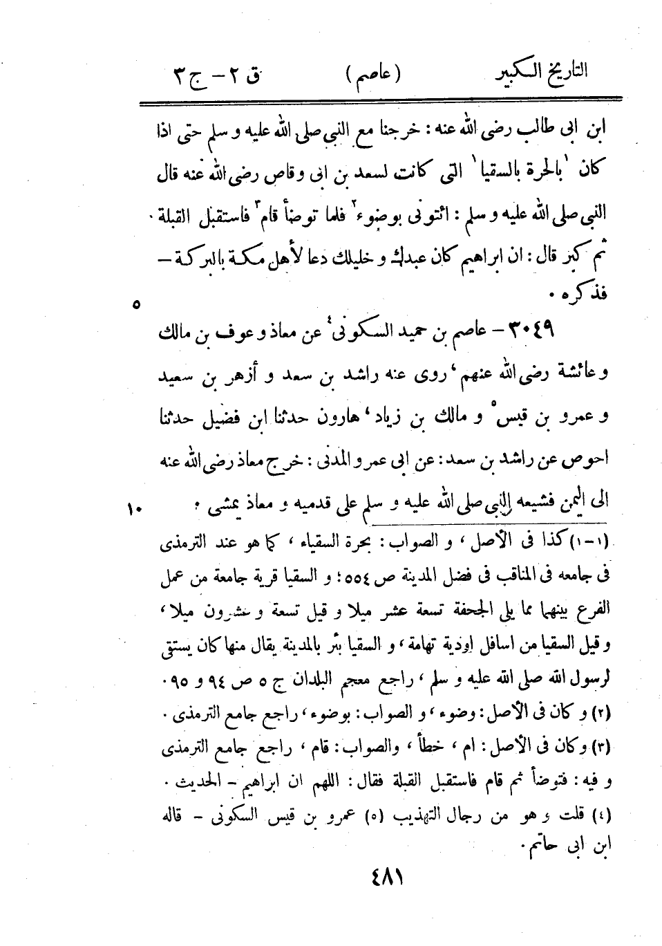 (1) قال الحافظ في تهذيب التهذيب: وقال البزار اختلفوا في اسم العنزي الذى رواه وهو غير معروف وقال البخاري: لا يصح، قلت وذكر قبله عن حصين عن عمرو فقال عن عمار بن عاصم (2) قلت وفى نسخة ثقات ابن حبان المخطوطة المخزونة في المكتبة الآصفية: عماد - مكان عمار (3) مابين المربعين كان ساقطا من الاصل ولابد منه لان صالح بن راشد من رواة عاصم لامن شيوخه، راجع الثقات والجرح والتعديل (4) وكان في الاصل: الجرجاني، وكذا في الثقات، والصواب: الجرجرائى، راجع الجرح والتعديل والتهذيب.