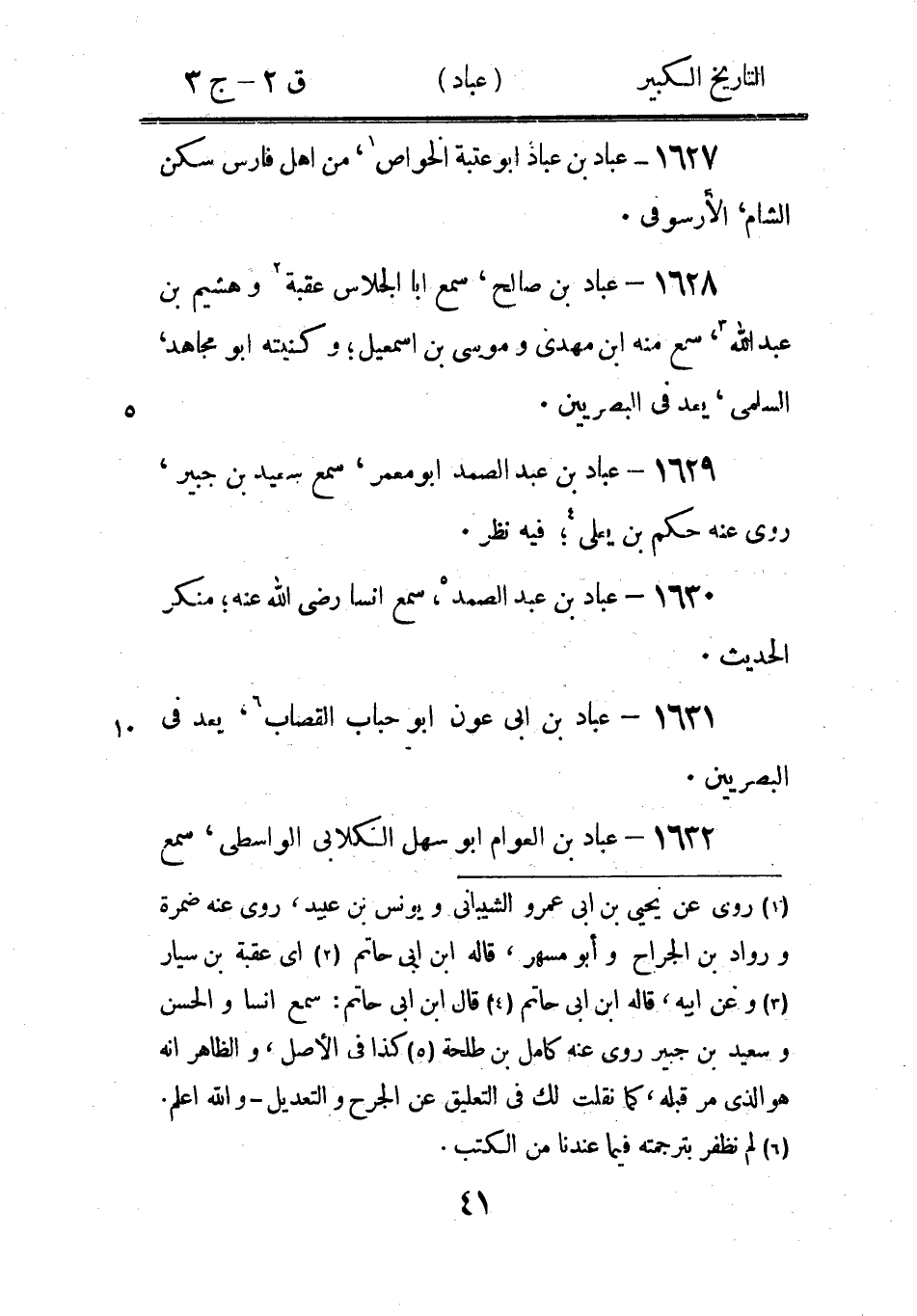 (1) قال ابن ابى حاتم: روى عنه بكربن بشر العسقلاني، قلت وكان في الاصل: بكير، تصحيف (2) وفى الجرح والتعديل: روى عن ختنه سارة عن ابى برزة روى عنه هشيم وقال شيخ لنا (3) ذكره في اللسان وقال: روى عن انس رضى الله عنه، راجعه تعلم ما فيه من الكلام (4) هو عبد الحميد بن قرط الضبى والد جرير ابن عبد الحميد، كذا ذكره ابن ابى حاتم (5) وكان في الاصل: الجذامي، وفى اللفظ الثاني: الحزامى، وهو الصواب، كما في الجرح والتعديل (6) كذا في الاصل، ولعله محرف، ولم نجد هذه الكنية من بين الكنى.