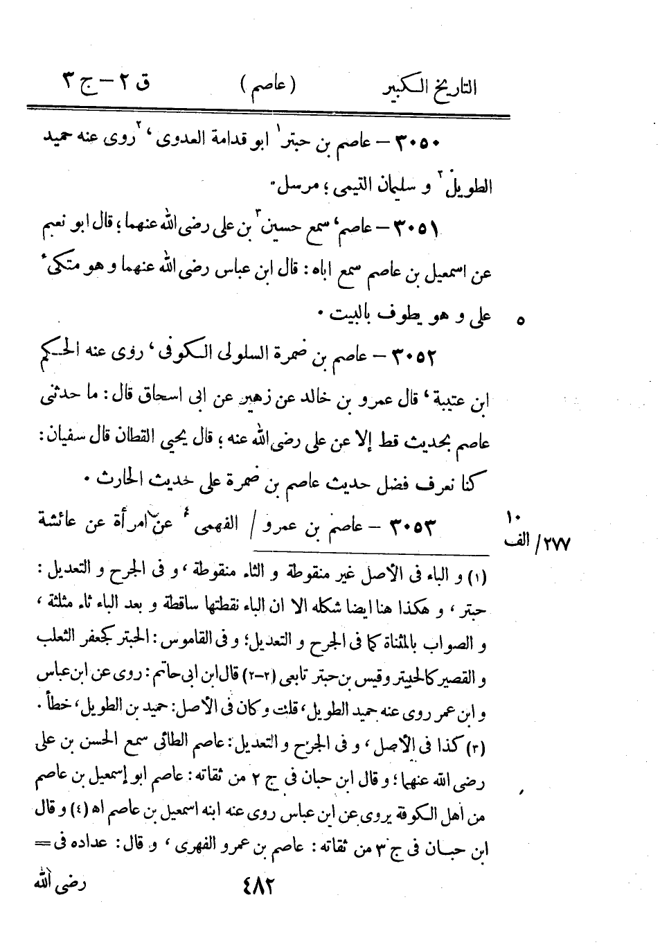 3073 - عاصم أَبُو مالك العطاردي: كَانَ يجيئني 1 رسول الْحَسَن فأشتري لَهُ، سَمِعَ منه زَيْد بْن حباب 2.