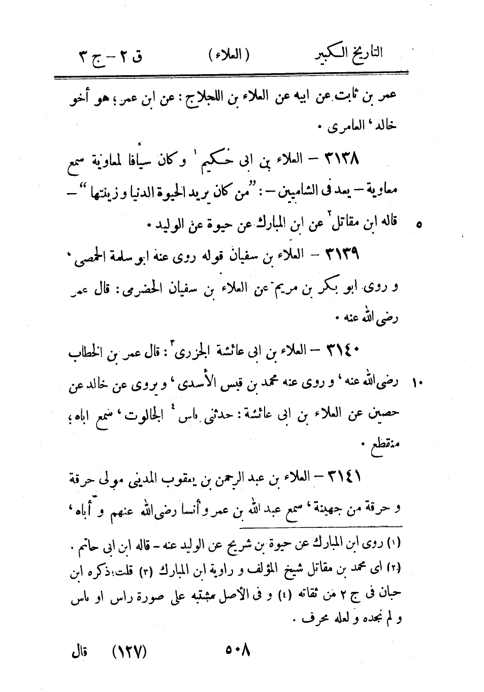 3171 - العلاء [بْن] 4 خَالِد 5 حَدَّثَنَا عطاء 5 وعلي بْن العلاء، وعَنْ قتادة وثابت، قال لنا مُوسَى 6: كَانَ عِنْدَ العلاء اربعة احاديث