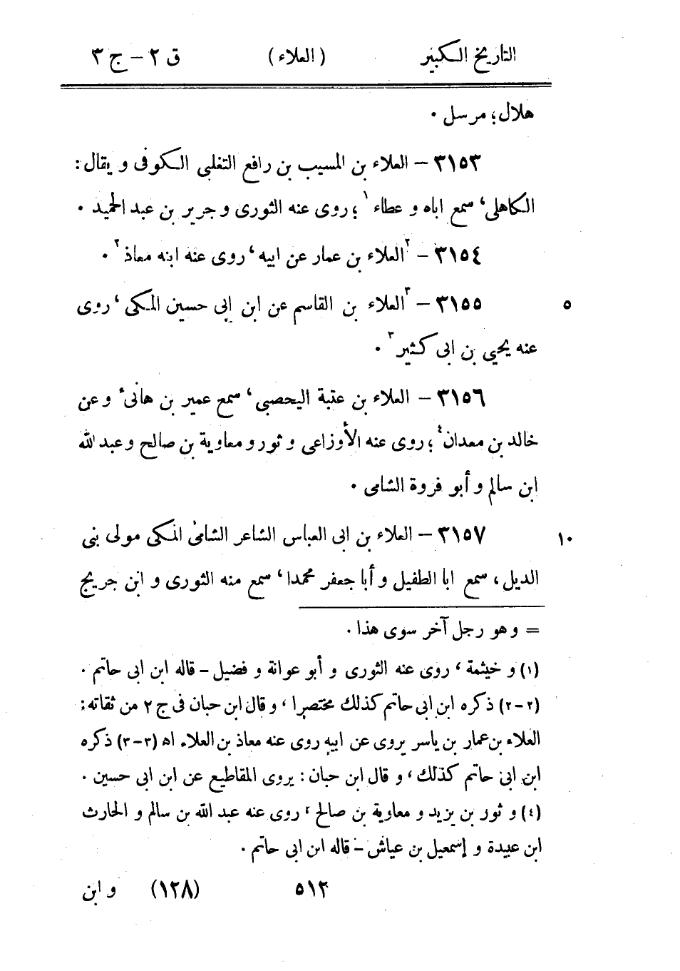 3183 - العلاء بْن زَيْد أَبُو مُحَمَّد الثَّقَفِيّ، يعد فِي الْبَصْرِيِّينَ، عن انس رضى الله عَنْهُ - منكر الْحَدِيث قَالَ: خدمت النَّبِيّ صَلَّى اللَّهُ عَلَيْهِ وَسَلَّمَ ثمان سنين قَالَ: أسبغ الوضوء - بطولَهُ، روى عَنْهُ يزيد بْن هارون 2، وَقَالَ عَمْرو بْن زرارة أَخْبَرَنَا مُحَمَّد بْن الْحَسَن عَنْ 2 عباد المنقري عَنْ عَلِيّ بْن زيد 3 عن انس رَضِيَ اللَّهُ عَنْهُ عَنِ النَّبِيِّ صَلَّى اللَّهُ عَلَيْهِ وَسَلَّمَ كَانَ أحدكم يتكلم فِي مُحَمَّد.