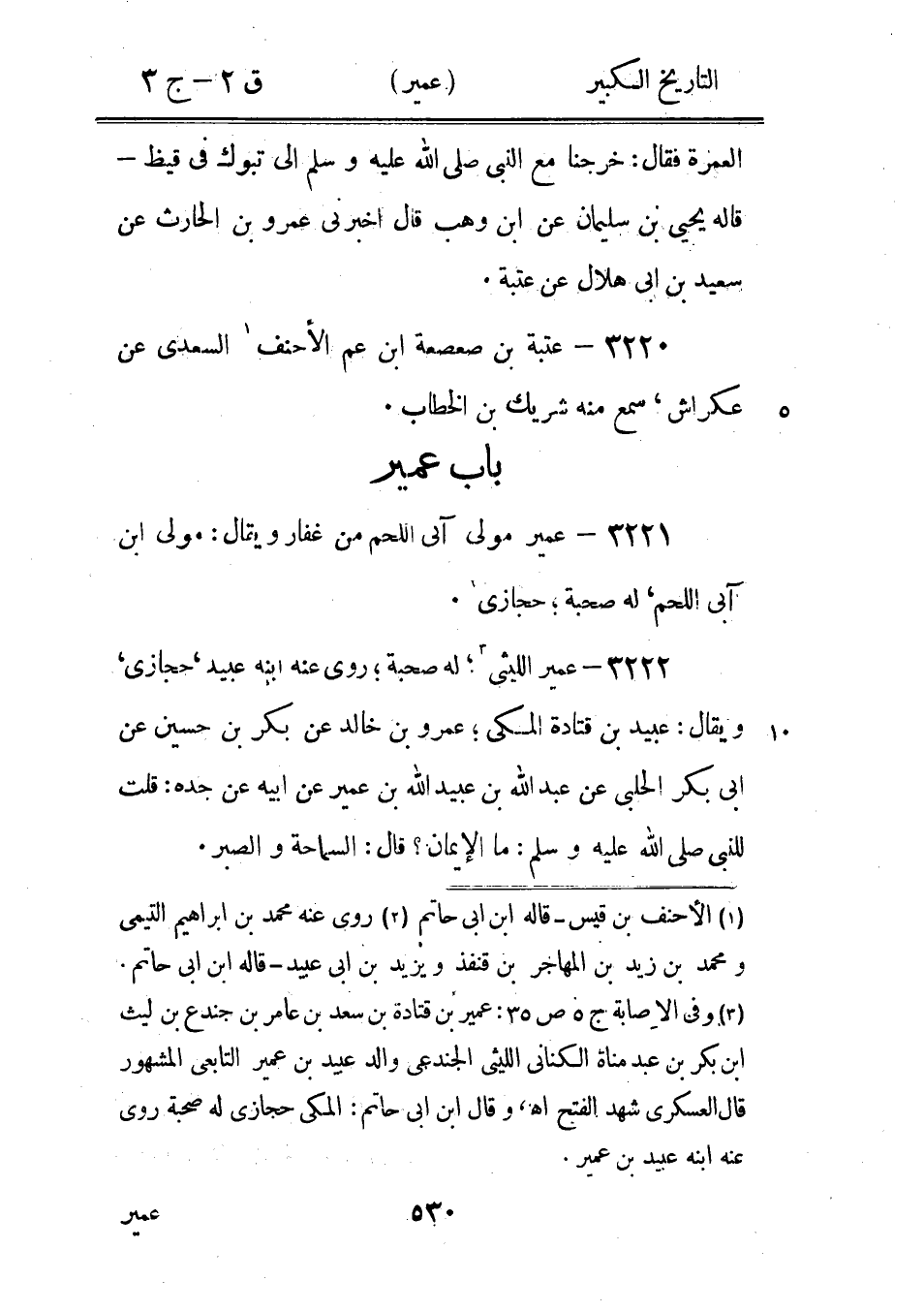 3246 - عمير رأى عتبة 3، قَالَ يَحْيَى بْن مُوسَى حَدَّثَنَا معن حَدَّثَنِي مخرمة عَنْ أَبِيهِ عَنْ عتبة بْن عمير سَمِعَ أباه: رأى عَمْرو بْن العاص يمسح على الخفين، وقال 4 ابن عيسى حدثنا ابن وهب حَدَّثَنَا عَمْرو 4 عَنْ بكر بْن سوادة عَنْ أَبِي رشدين هو عُبَيْد 5: رأى عُمَرا - مثله.