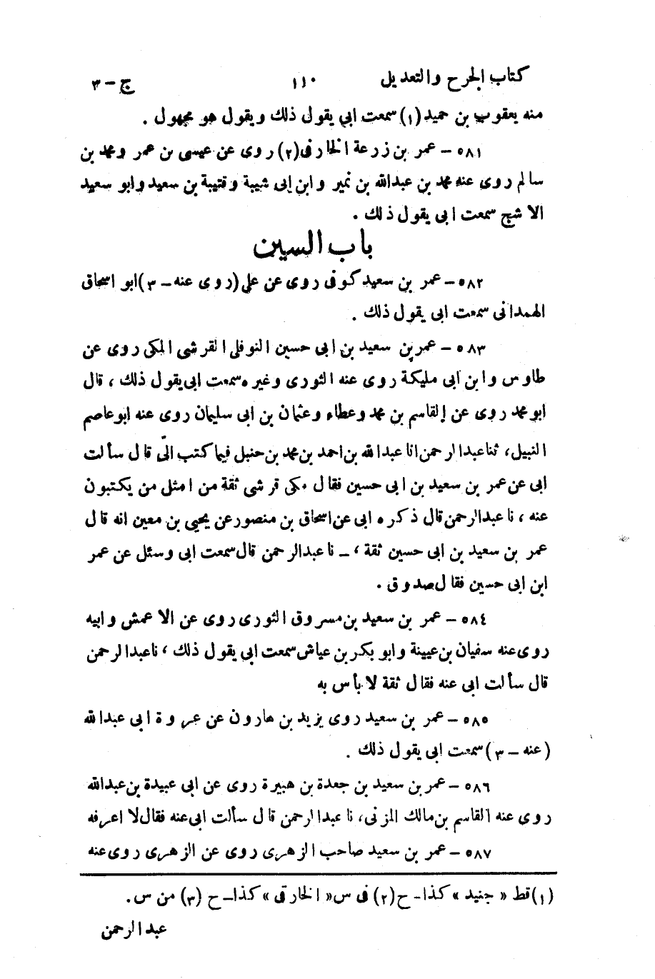 حَدَّثنا عَبد الرَّحمن، أَخبَرنا عَبد الله بن أَحمد بن محمد بن حَنبل، فيما كَتَبَ إلَيَّ، قال: سَألتُ أَبي عن عُمر بن سَعيد بن أَبي حسين، فقال: مَكّيٌّ قرشي ثقة، من أمثل من يكتبون عنه.