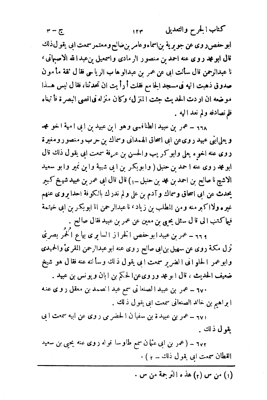 حَدَّثنا صالح بن أَحمد بن محمد بن حَنبل، قال: قال أَبي: عُمر بن عُبَيد شيخ كبير، يحدث عَن أَبي إِسحاق، وسماك، وآدم بن علي، ولم ندرك بالكوفة أحدًا يروي عنهم غيره، ولا أكبر منه ومن المطلب بن زياد.
