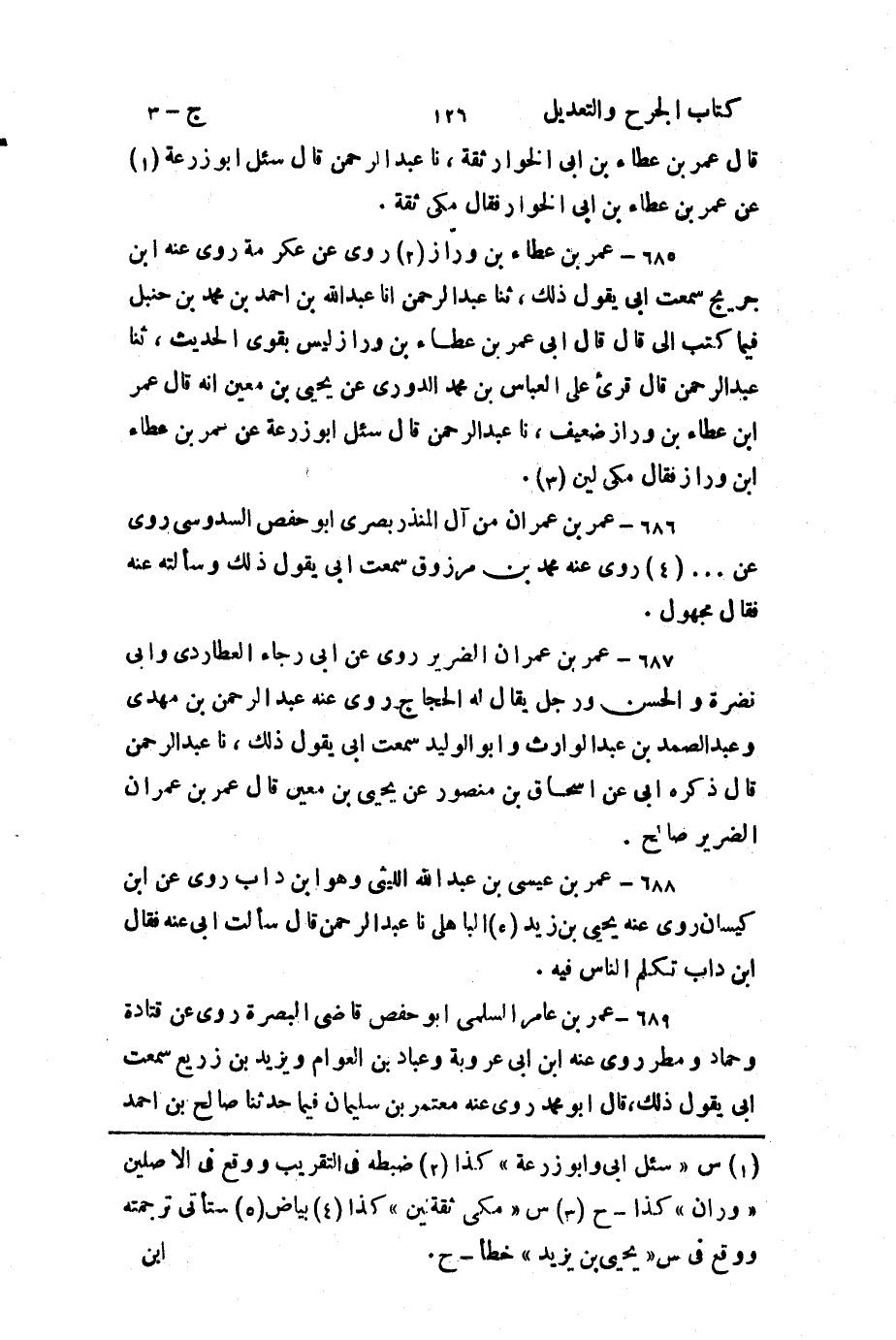 قال محمود: وفي المطبوع من "تاريخ الدوري عن ابن مَعين"، "وراز"، وذكر محققه أيضا أَنه في النسخ الخطية: "وَزَّان"، وبدَّلاهُ في المطبوع إلى: "وَرَاز"، ظنا منهما أَنه الصواب، وفي مطبوع "تهذيب الكمال" 4876: عُمر بن عطاء بن وَرَاز، ويقال: ورازة.