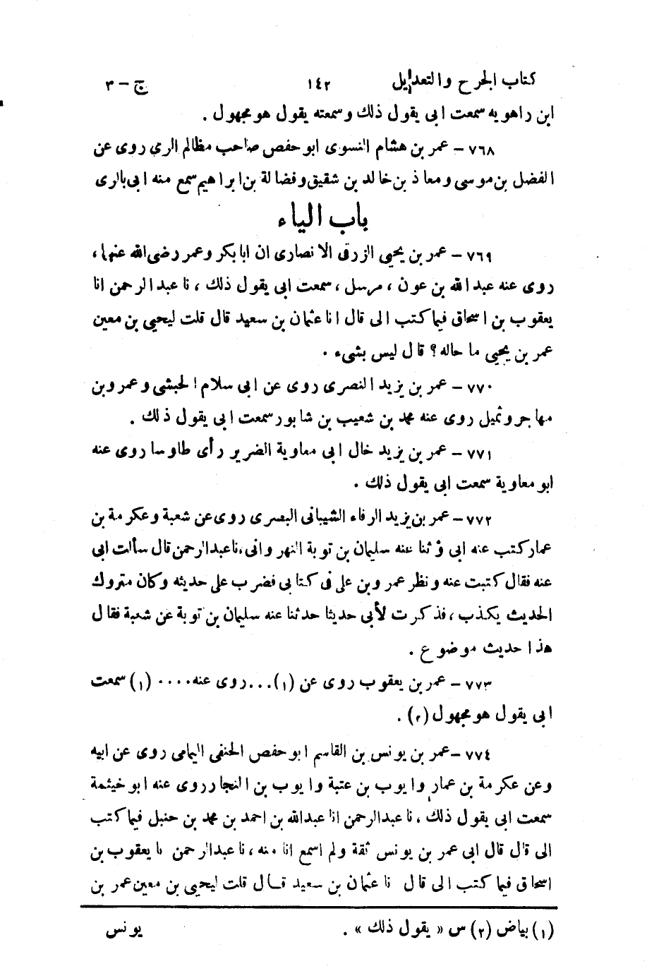 حَدَّثنا عَبد الرَّحمن، أَخْبَرنا يعقوب بن إِسحاق، فيما كَتَبَ إلَيَّ، قال: أَخبَرنا عثمان بن سعيد، قال: قلتُ ليحيى بن مَعين: عُمر بن يَحيَى ما حاله؟ قال: ليس بشيءٍ.