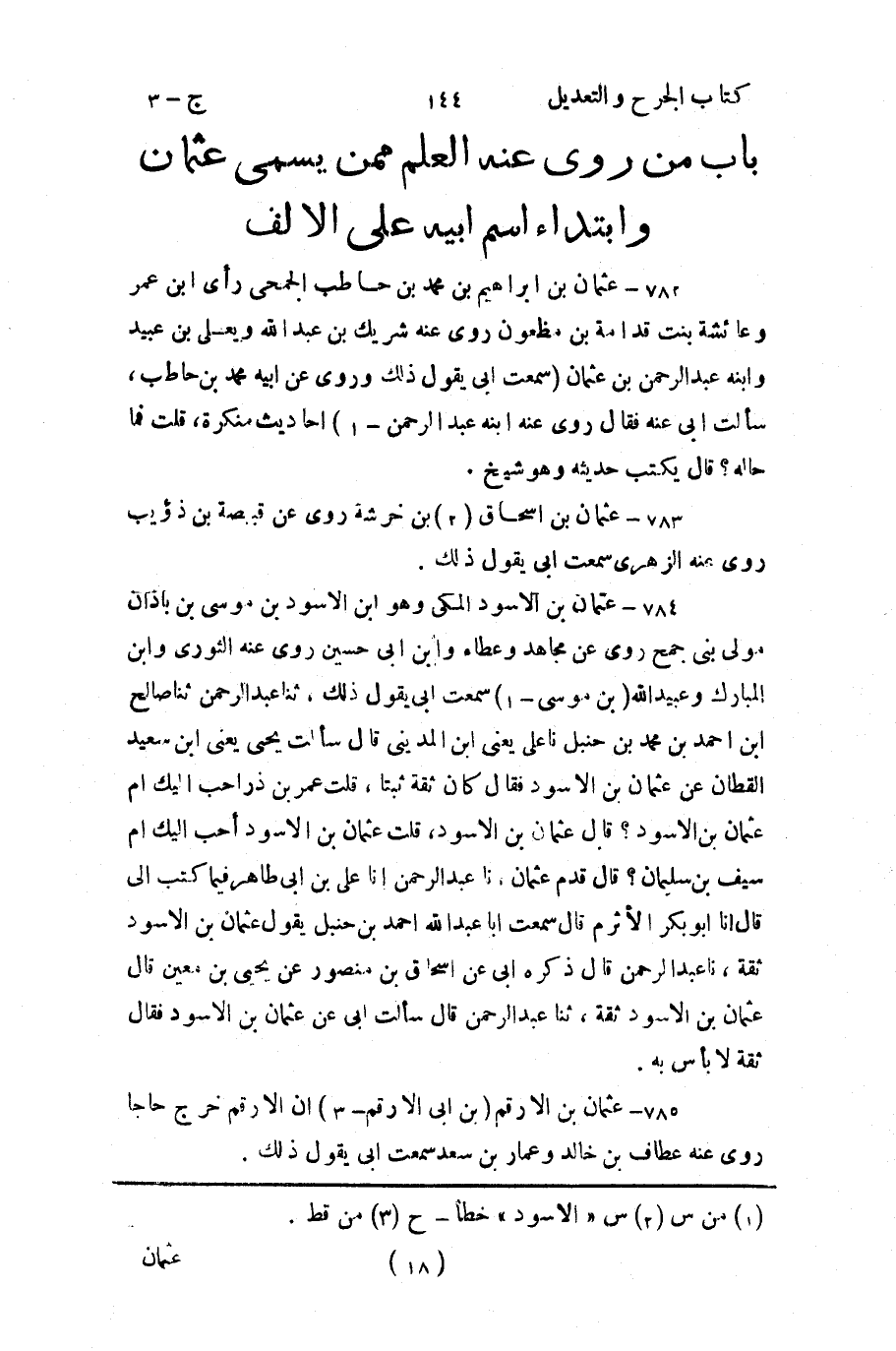 - باب من رُوي عنه العلم مِمَّن يُسَمَّى عثمان، وإبتداء اسم أَبيه على الألف.