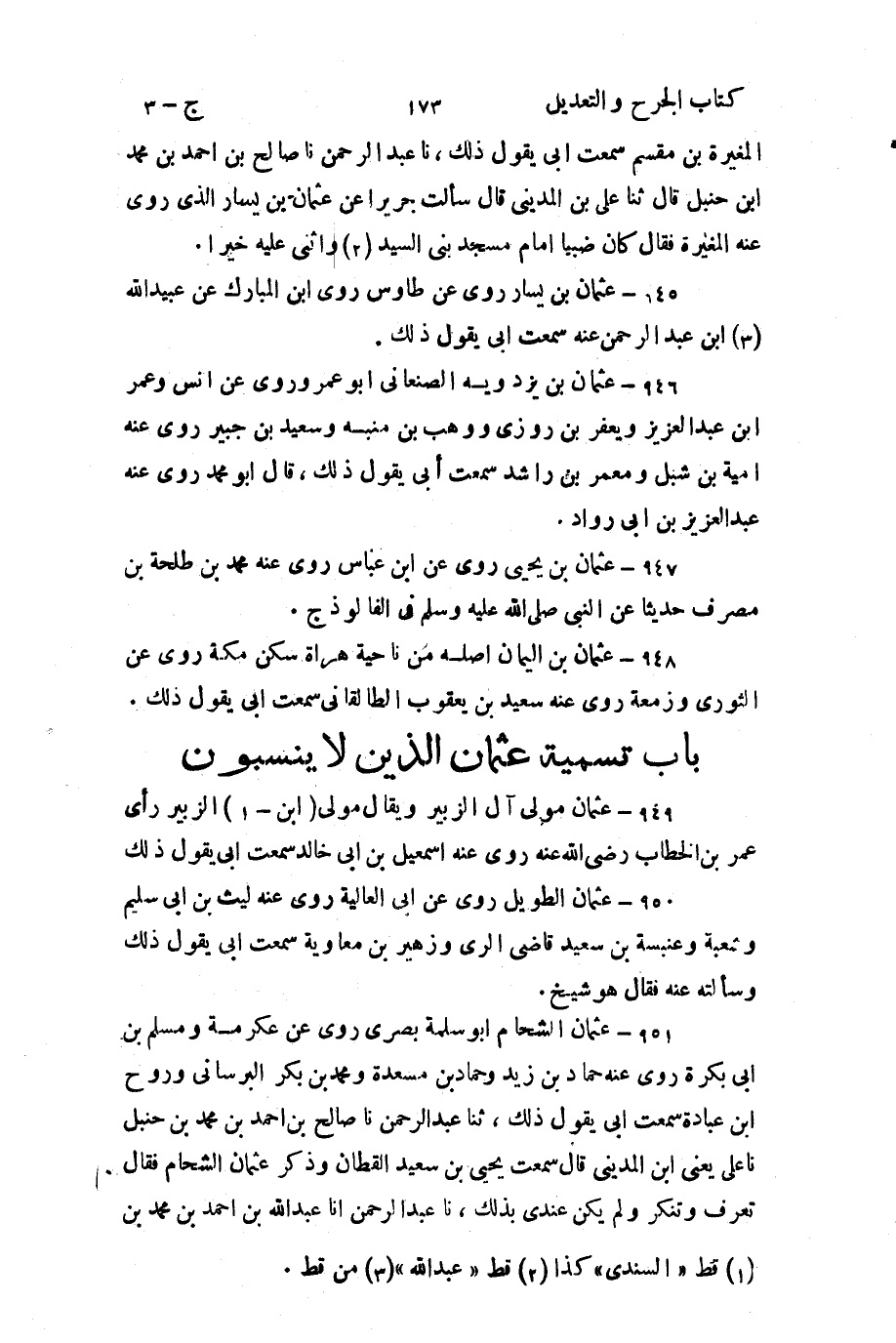 حَدَّثنا عَبد الرَّحمن، حَدَّثنا صالح بن أَحمد بن محمد بن حَنبل، حَدَّثنا علي، يَعني ابن المَديني، قال: سَمِعتُ يَحيَى بن سَعيد القطان، وذكر عثمان الشحام، فقال: تعرف وتنكر، ولم يكن عندي بذلك.