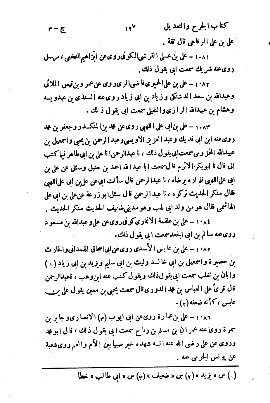حَدَّثنا عَبد الرَّحمن، قال: سُئِل أَبو زُرعَة عن عَلي بن أَبي علي الهاشمي، فقال: هُو من ولد أبي لهب، وهو مَدينيٌّ ضعيف الحديث مُنكَر الحديث.