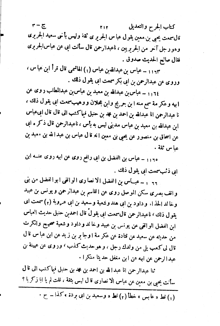 حَدَّثنا عَبد الرَّحمن، قال: سَمِعتُ أَبي يقول: قال أَحمد بن حَنبل: حديث العباس بن الفضل الواقفي عن يُونُس بن عُبَيد، وخالد، وداود، وشُعبة صحيح، وأنكرت من حديثه: عن سعيد، عن قتادة عن عكرمة، أَو جابر بن زيد، عَن ابن عباس، قال: قال لي كعب: يلى من ولدك رجل، وهو حديث كذب، وروى عن عُيَينة بن عَبد الرَّحمن، عَن أَبيه، عَن ابن مُغَفَّل حديثا منكرًا.