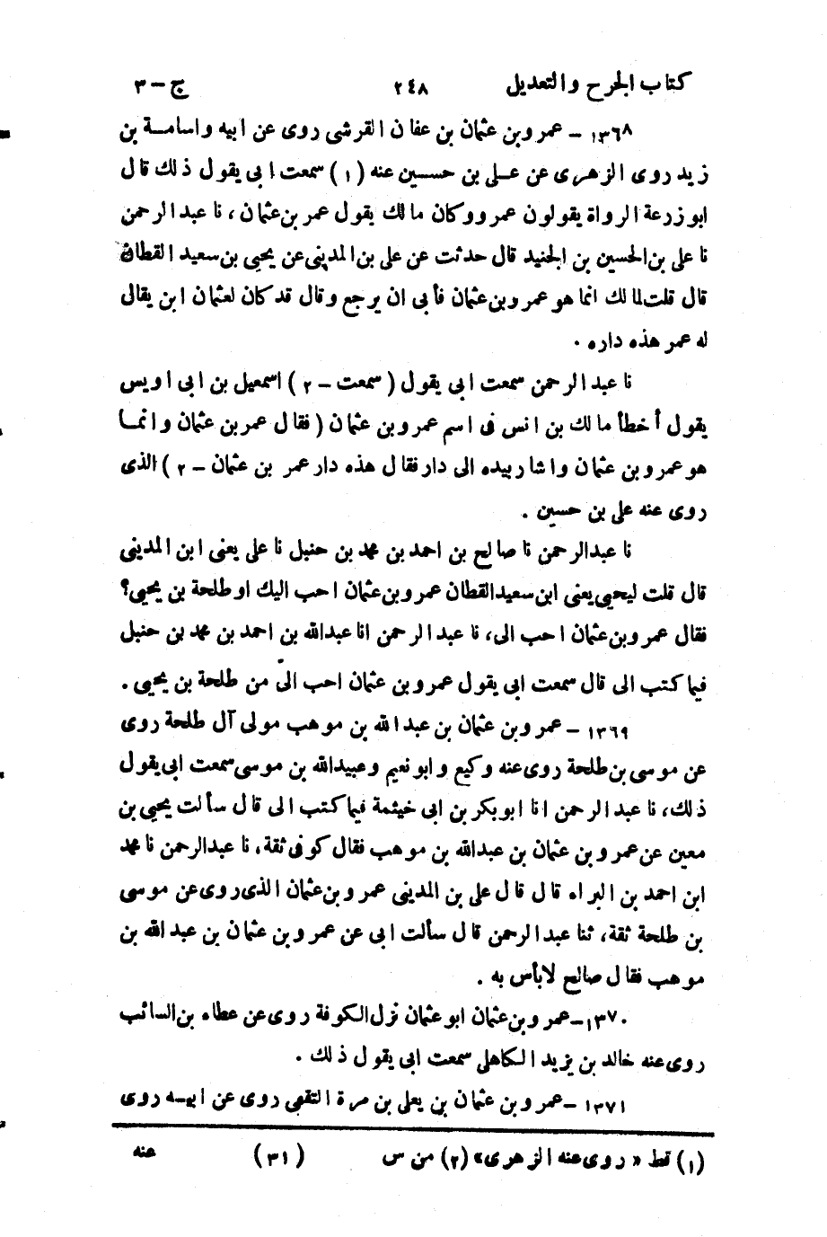 حَدَّثنا عَبد الرَّحمن، حَدَّثنا عَلي بن الحسين بن الجنيد، قال: حُدِّثْتُ عن عَلي بن المَديني، عن يَحيَى بن سَعيد القطان، قال: قلتُ لمالك: إِنما هو عَمرو بن عثمان، فأبى أَن يرجع، وقال: قد كان لعثمان ابنٌ يقال له: عُمر، هذه داره.