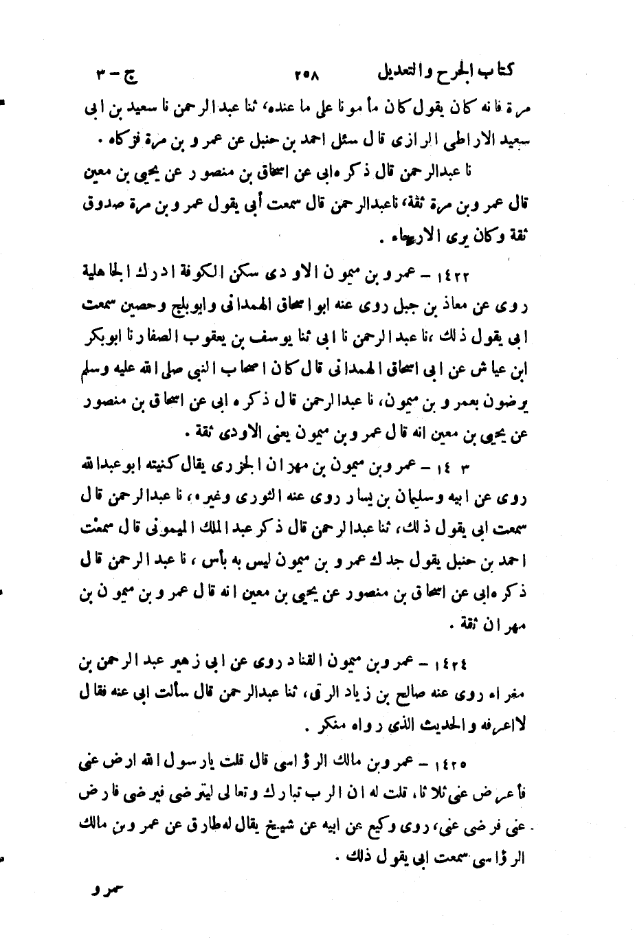 حَدَّثنا عَبد الرَّحمن، حَدَّثنا أَبي، حَدَّثنا يوسف بن يعقوب الصفار، حَدَّثنا أَبو بكر بن عَيَّاش، عَن أبي إِسحاق الهمداني قال: كان أَصحاب النبي صَلى الله عَليه وسَلم يرضون بعَمرو بن ميمون.