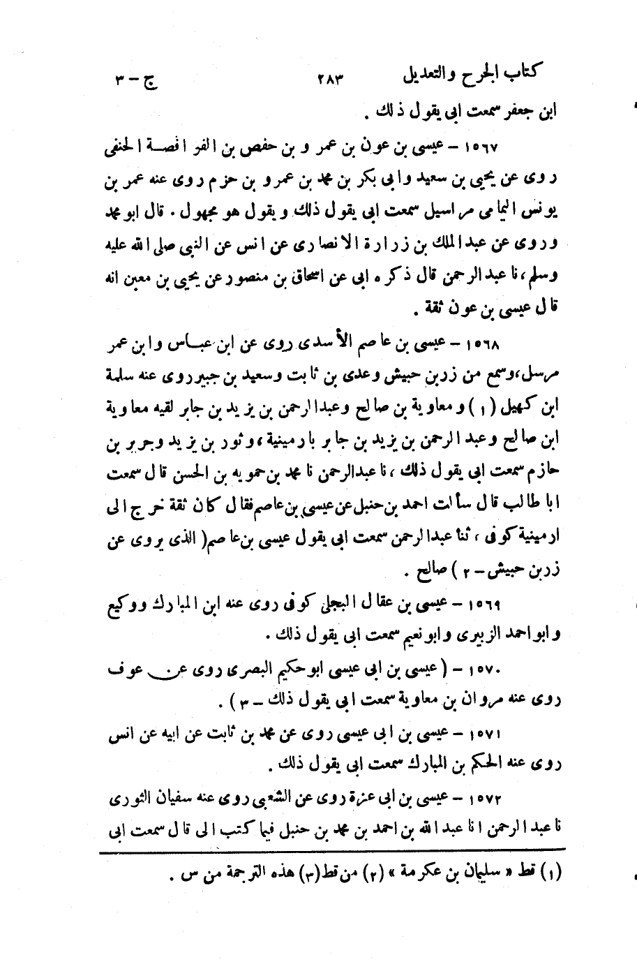 حَدَّثنا عَبد الرَّحمن، حَدَّثنا محمد بن حمويه بن الحسن، قال: سَمِعتُ أبَا طالب، قال: سأَلتُ أَحمد بن حَنبل عن عيسَى بن عاصم، فقال: كان ثقة، خرج إلى أرمينية، كُوفيٌّ.