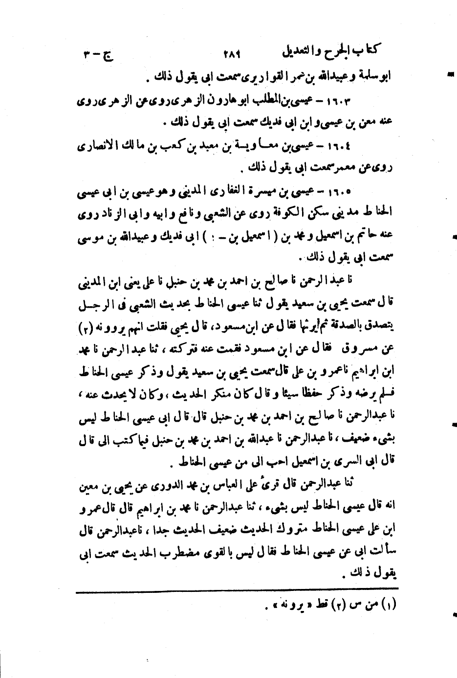 حَدَّثنا عَبد الرَّحمن، حَدَّثنا صالح بن أَحمد بن محمد بن حَنبل، قال: قال أَبي: عيسَى الحناط ليس بِشيءٍ ضعيف.