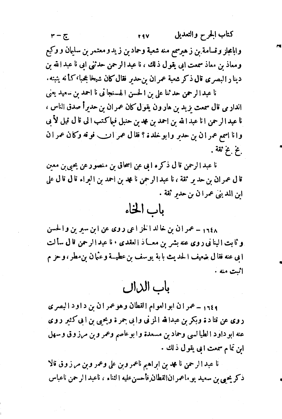 حَدَّثنا عَبد الرَّحمن، حَدَّثنا عباس بن محمد الدُّوري، قال: سَمِعتُ يَحيَى بن مَعين يقول: عِمران القطان ليس بالقَوي، وهو دون أبي هلال، ولم يكن لأَبي هلال كتاب.