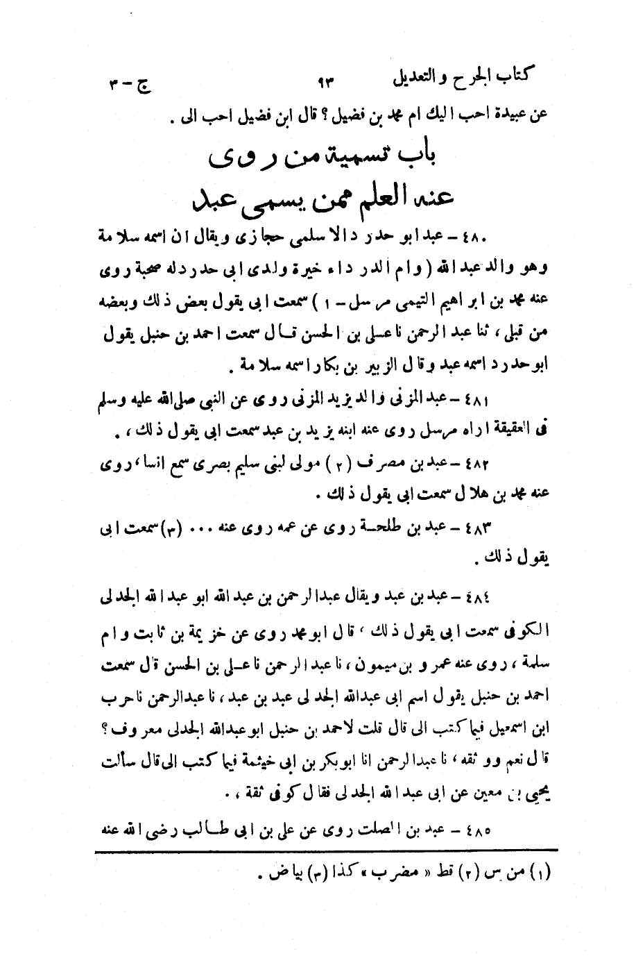 حَدَّثنا عَبد الرَّحمن، حَدَّثنا عَلي بن الحسن، قال: سَمِعتُ أَحمد بن حَنبل يقول: اسم أبي عَبد الله الجدلي عَبد بن عبد.