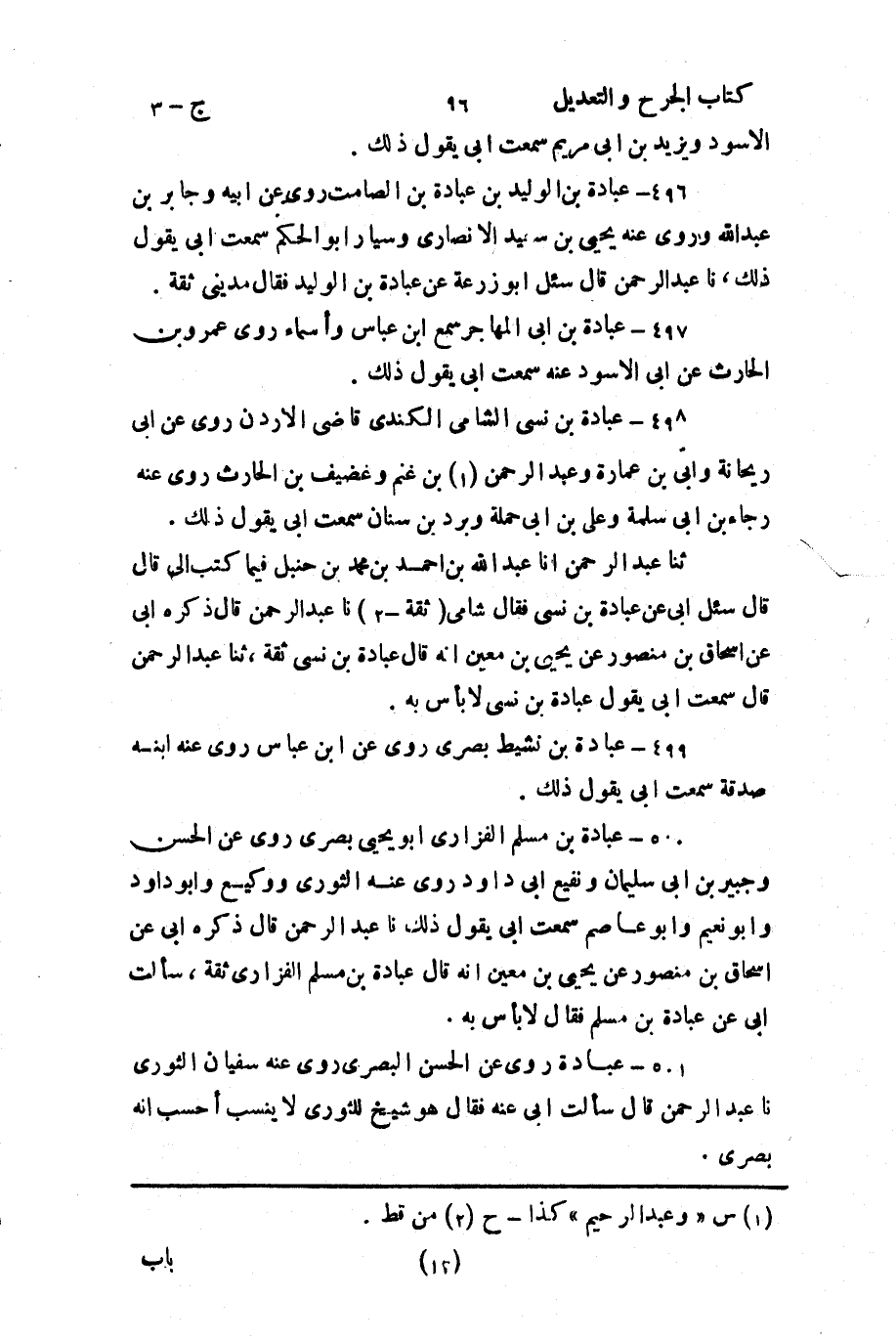 حَدَّثنا عَبد الرَّحمن، أَخبَرنا عَبد الله بن أَحمد بن محمد بن حَنبل، فيما كَتَبَ إلَيَّ، قال: قال: سُئِلَ أَبي عن عبادة بن نُسَي، فقال: شامي ثقة.