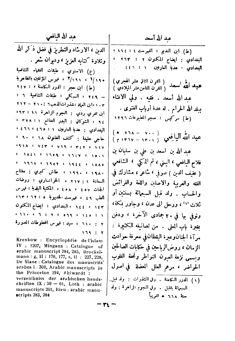 عبد الله اليافعي (700 - 768 هـ) (1301 - 1367 م) عبد الله بن اسعد بن علي بن سليمان بن فلاح اليافعي، اليمني، ثم المكي، الشافعي (عفيف الدين) صوفي، شاعر، مشارك في الفقه والعربية والاصلين واللغة والفرائض والحساب.