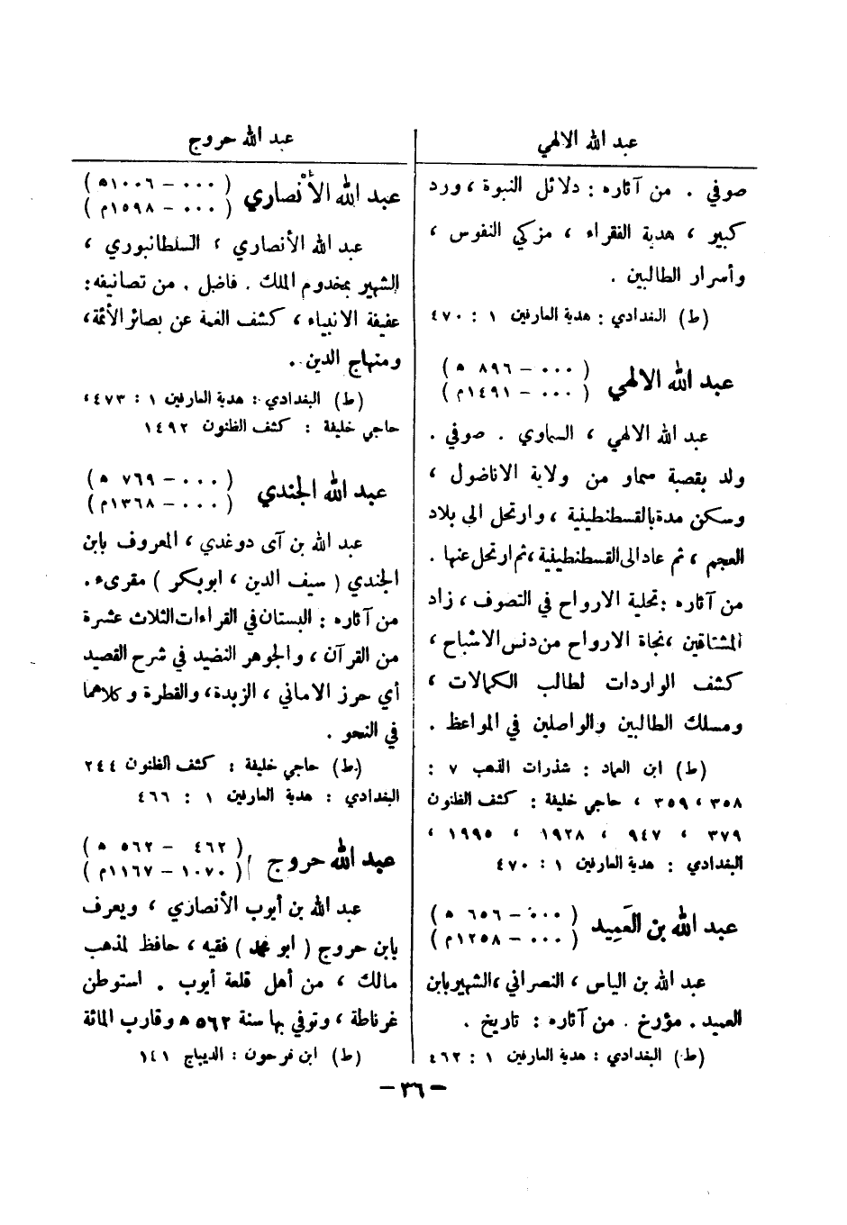 (ط) ابن العماد: شذرات الذهب 7: 358، 359، حاجي خليفة: كشف الظنون 379، 947، 1928، 1995، البغدادي: هدية العارفين 1: 470 عبد الله بن العميد (000 - 656 هـ) (000 - 1258 م) عبد الله بن الياس، النصراني، الشهير بابن العميد.