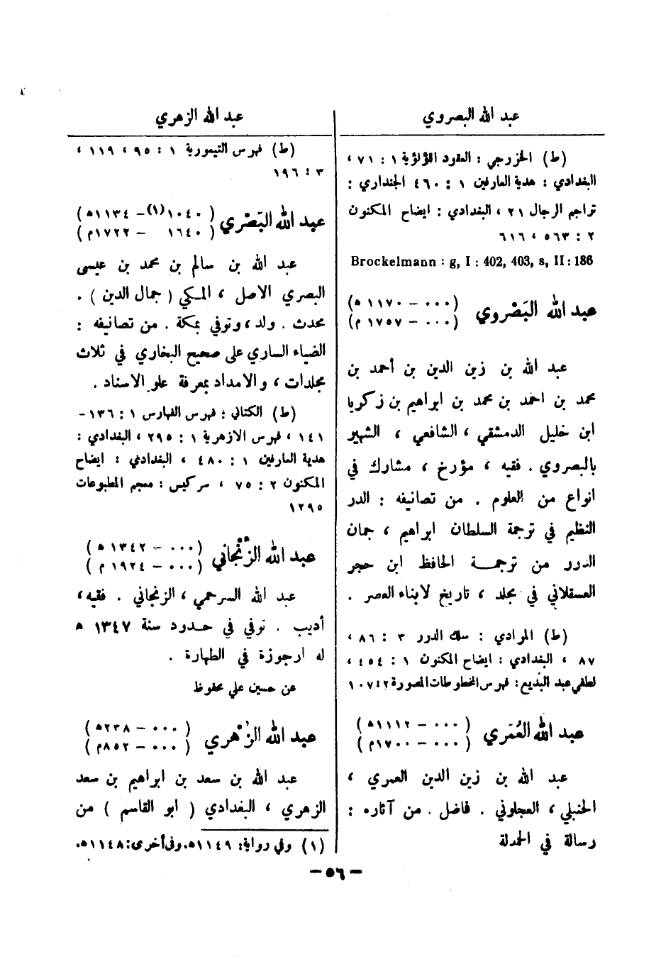 (ط) الخزرجي: العقود اللؤلؤية 1: 71، البغدادي: هدية العارفين 1: 460 الجنداري: تراجم الرجال 21، البغدادي: ايضاح المكنون 2: 563، 616 186: Brockelmann: g , I: 204 , 304 , s , II عبد الله البصروي (000 - 1170 هـ) (000 - 1757 م) عبد الله بن زين الدين بن أحمد بن محمد بن احمد بن محمد بن ابراهيم بن زكريا ابن خليل الدمشقي، الشافعي، الشهير بالبصروي.