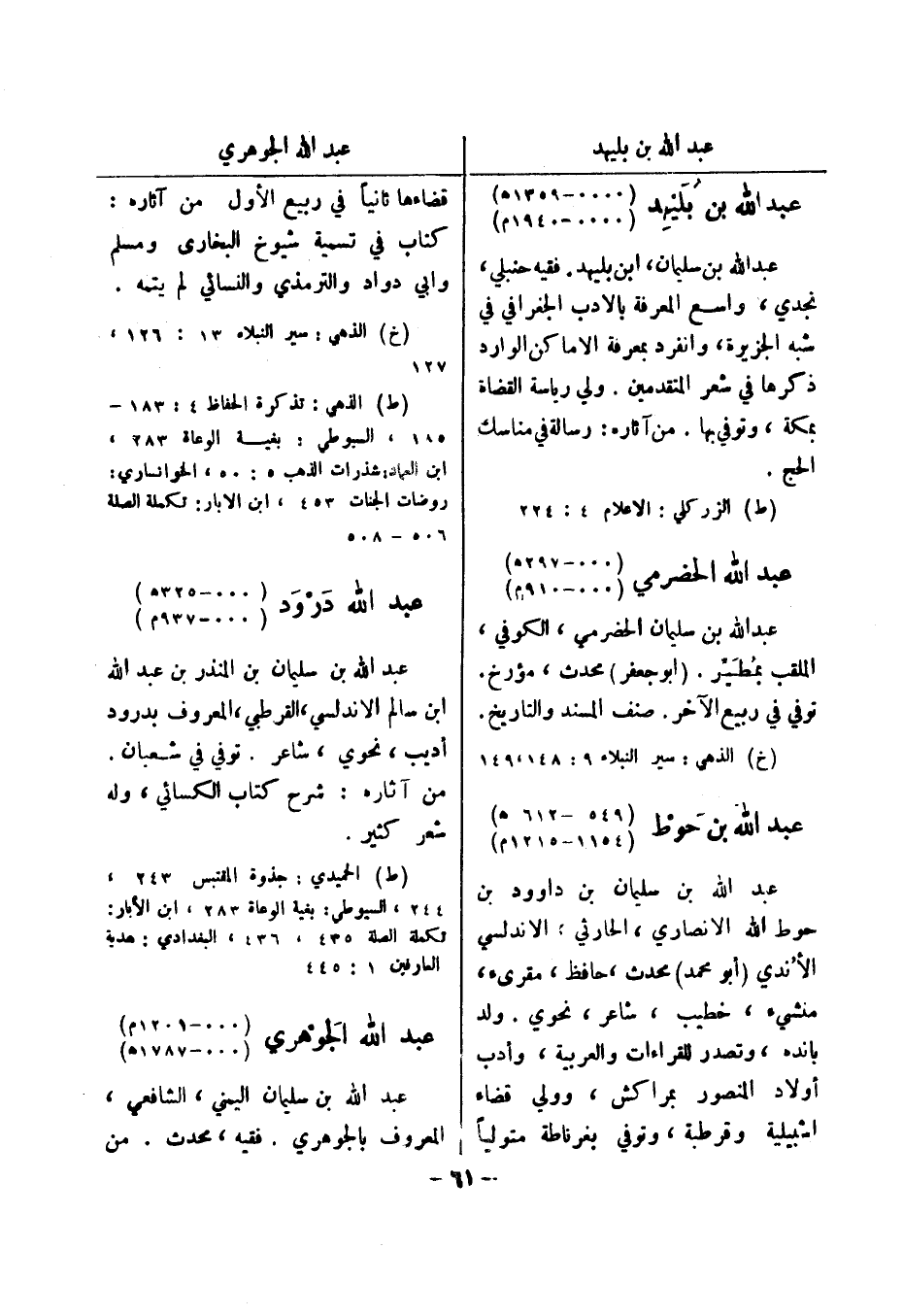(ط) الحميدي: جذوة المقتبس 243، 244، السيوطي: بغية الوعاة 283، ابن الابار: تكملة الصلة 435، 436، البغدادي: هدية العارفين 1: 445 عبد الله الجوهري (000 - 1201 م) (000 - 1787 هـ) عبد الله بن سليمان اليمني، الشافعي، المعروف بالجوهري.