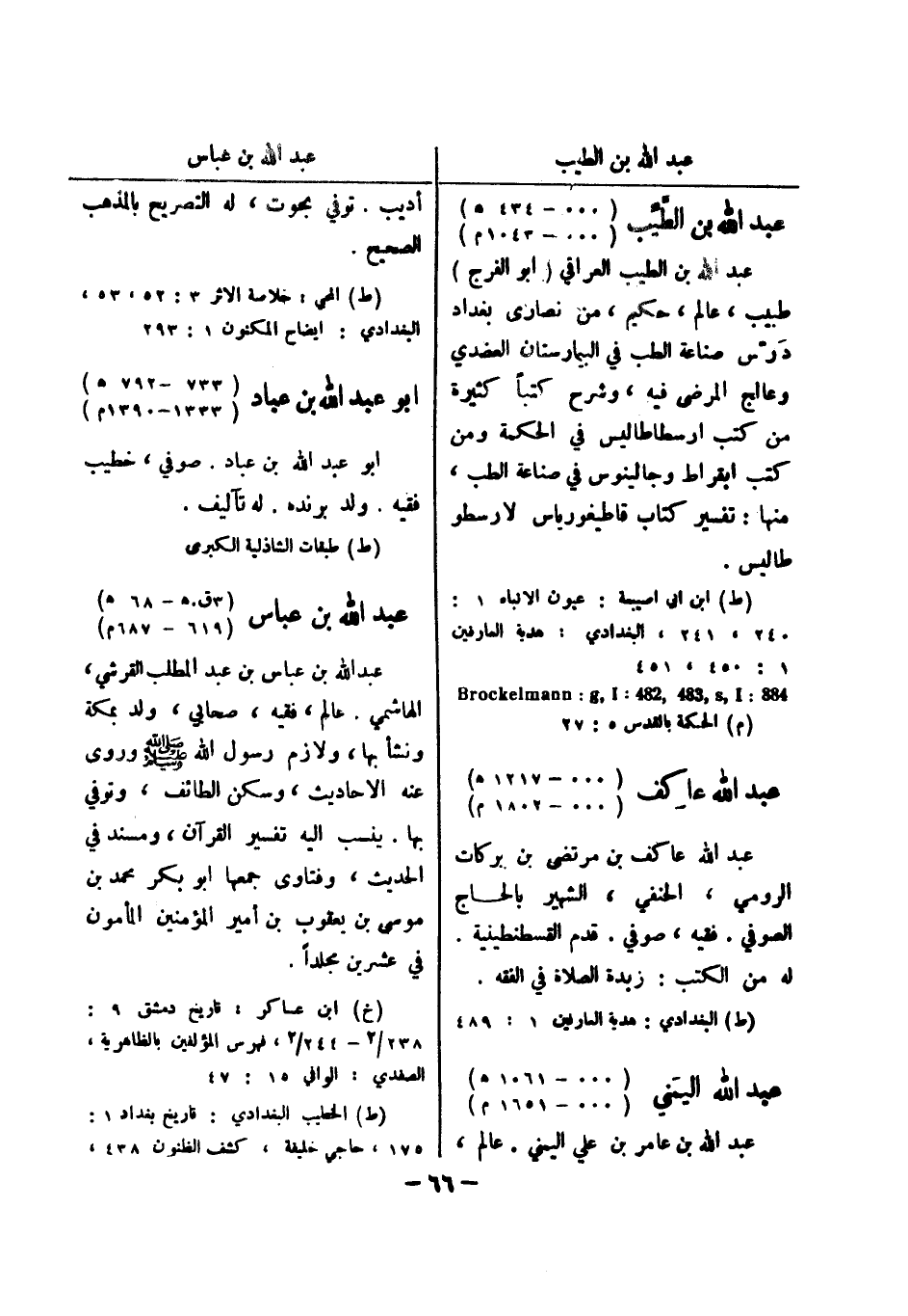 (ط) ابن ابي اصيبعة: عيون الانباء 1: 240، 241، البغدادي: هدية العارفين 1: 450، 451،
