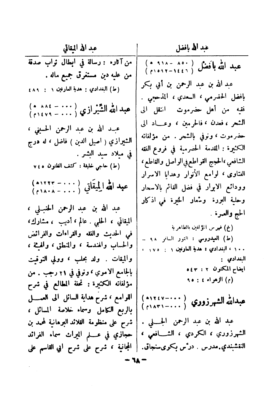 (ط) حاجي خليفة: كشف الظنون 745 عبد الله الميقاتي (000 - 1223 هـ) (000 - 1808 م) عبد الله بن عبد الرحمن الحنبلي، الميقاتي، الحلبي.