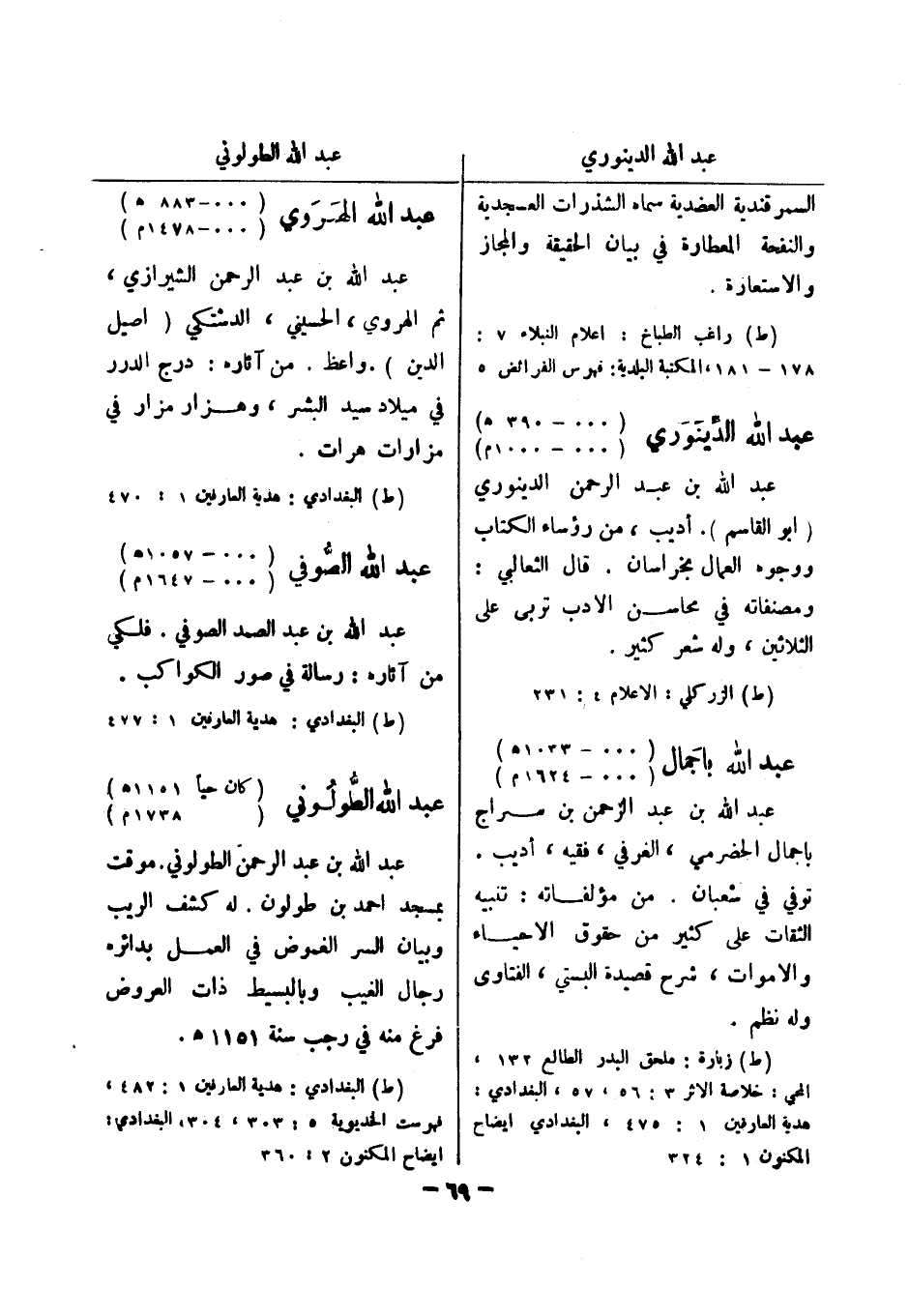 (ط) البغدادي: هدية العارفين 1: 477 عبد الله الطولوني (كان حيا 1151 هـ) (1738 م) عبد الله بن عبد الرحمن الطولوني.