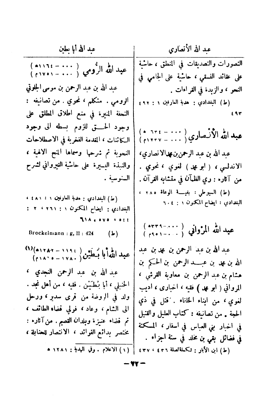 (ط) البغدادي: هدية العارفين 1: 481، البغدادي: ايضاح المكنون 1: 261، 2: 544، 575، 618 (ط) 424: Brockelmann: g , II عبد الله أبا بطين (1194 - 1282 هـ) (1) (1780 - 1865 م) عبد الله بن عبد الرحمن النجدي، الحنبلي، أبا بطين.