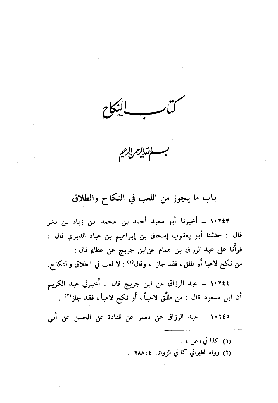 ١٠٢٤٣ - أَخْبَرَنَا أَبُو سَعِيدٍ أَحْمَدُ بْنُ مُحَمَّدِ بْنِ زِيَادِ بْنِ بِشْرٍ قَالَ: حَدَّثَنَا أَبُو يَعْقُوبَ إِسْحَاقُ بْنُ إِبْرَاهِيمَ بْنِ عَبَّادٍ الدَّبَرِيُّ قَالَ: قرأْنَا عَلَى عَبْدِ الرَّزَّاقِ بْنِ هَمَّامٍ، عَنِ ابْنِ جُرَيْجٍ، عَنْ عَطَاءٍ قَالَ: «مَنْ نَكَحَ لَاعِبًا أَوْ طَلَّقَ فَقَدْ جَازَ»، وَقَالَ: «لَا لَعِبَ فِي الطَّلَاقِ وَالنِّكَاحِ»
