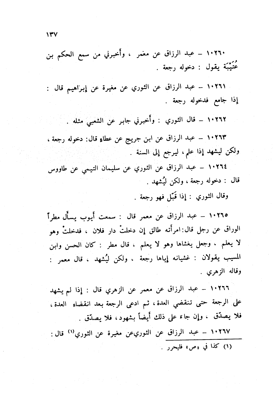 ١٠٢٦٦ - عَنْ مَعْمَرٍ، عَنِ الزُّهْرِيِّ قَالَ: «إِذَا لَمْ يُشْهِدْ عَلَى الرَّجْعَةِ حَتَّى تَنْقَضِيَ الْعِدَّةُ ثُمَّ ادَّعَى الرَّجْعَةَ بَعْدَ انْقِضَاءِ الْعِدَّةِ فَلَا يُصَدَّقُ، وَإِنْ جَاءَ عَلَى ذَلِكَ أَيْضًا بِشُهُودٍ فَلَا يُصَدَّقُ»