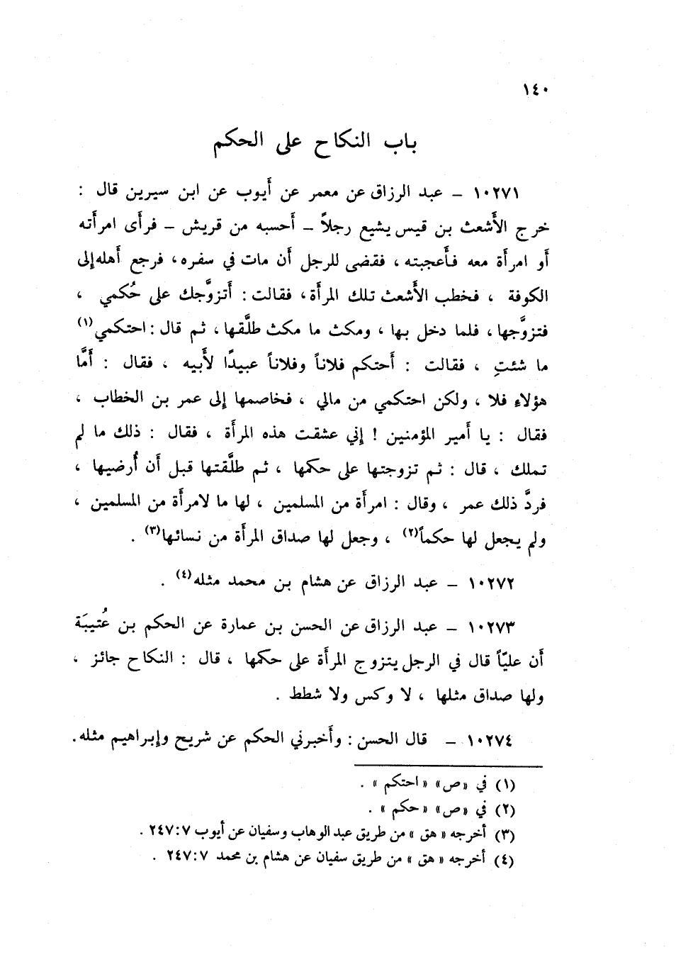 ١٠٢٧١ - عَنْ مَعْمَرٍ، عَنْ أَيُّوبَ، عَنِ ابْنِ سِيرِينَ قَالَ: خَرَجَ الْأَشْعَثُ بْنُ قَيْسٍ يُشَيِّعُ رَجُلًا أَحْسَبُهُ مِنْ قُرَيْشٍ، فَرَأَى امْرَأَتَهُ أَوِ امْرَأَةً مَعَهُ فَأَعْجَبَتْهُ، فَقُضِيَ لِلرَّجُلِ أَنْ مَاتَ فِي سَفَرِهِ، فَرَجَعَ أَهْلُهُ إِلَى الْكُوفَةِ، فَخطَبَ الْأَشْعَثُ تِلْكَ الْمَرْأَةَ، فَقَالَتْ أَتَزَوَّجُكَ عَلَى حُكْمِي، فَتَزَوَّجَهَا، فَلَمَّا دَخَلَ بِهَا، وَمَكَثَ مَا مَكَثَ طَلَّقَهَا، ثُمَّ قَالَ: احْتَكِمِي مَا شِئْتِ "، فَقَالَتْ: أَحْتَكُمْ فُلَانًا وَفُلَانًا عَبِيدًا لِأَبِيهِ، فَقَالَ: أَمَّا هَؤُلَاءِ فَلَا، وَلَكِنِ احْتَكِمِي مِنْ مَالِي، فَخَاصَمَهَا إِلَى عُمَرَ بْنِ الْخَطَّابِ، فَقَالَ: يَا أَمِيرَ الْمُؤْمِنِينَ، إِنِّي عَشِقْتُ هَذِهِ الْمَرْأَةَ، فَقَالَ: «ذَلِكَ مَا لَمْ تَمْلِكْ» قَالَ: ثُمَّ تَزَوَّجْتُهَا عَلَى حُكْمِهَا، ثُمَّ طلَّقْتُهَا قَبْلَ أَنْ أُرْضِيَهَا، فَرَدَّ ذَلِكَ عُمَرُ، وَقَالَ: «امْرَأَةٌ مِنَ الْمُسْلِمِينَ لَهَا مَا لِامْرَأَةٍ مِنَ الْمُسْلِمِينَ»، وَلَمْ يَجْعَلْ لَهَا حُكْمًا، وَجَعَلَ لَهَا صَدَاقَ الْمَرْأَةِ مِنْ نِسَائِهَا. عَبْدُ الرَّزَّاقِ،
