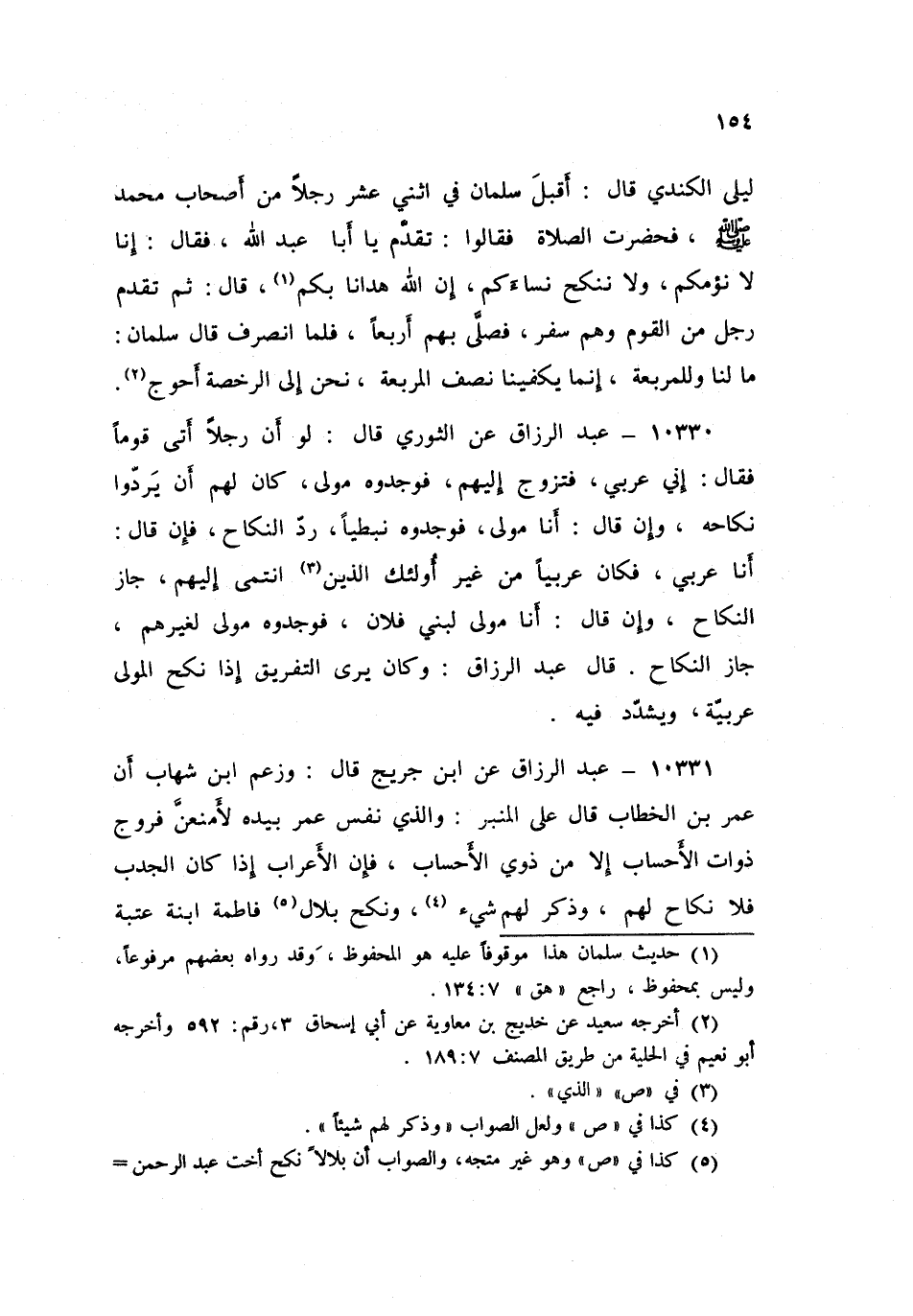 ١٠٣٣١ - عَنِ ابْنِ جُرَيْجٍ قَالَ: وَزَعَمَ ابْنُ شِهَابٍ: أَنَّ عُمَرَ بْنَ الْخَطَّابِ، قَالَ عَلَى الْمِنْبَرِ: «وَالَّذِي نَفْسُ عُمَرَ بِيَدِهِ، لَأَمْنَعَنَّ فُرُوجَ ذَوَاتِ الْأَحْسَابِ إِلَّا مِنْ ذَوِي الْأَحْسَابِ، فَإِنَّ الْأَعْرَابَ إِذَا كَانَ الْجَدْبُ فَلَا نِكَاحَ لَهُمْ»، وَذَكَرَ لَهُمْ شَيْئًا، وَنَكَحَ بِلَالٌ فَاطِمَةَ ابْنَةَ عُتْبَةَ بْنِ رَبِيعَةَ، وَنَكَحَ بَعْدَهَا ابْنَةَ عُتْبَةَ بْنِ الْوَلِيدِ بْنِ رَبِيعَةَ خَالَةً مِنَ الْأَنْصَارِ، فَتَبَنَّاهُ أَبُو حُذَيْفَةَ كَمَا تَبَنَّى النَّبِيُّ صَلَّى اللهُ عَلَيْهِ وَسَلَّمَ زَيْدًا، حَتَّى نَزَلَتْ: {ادْعُوهُمْ لِآبَائِهِمْ} [الأحزاب: ٥] الْآيَةَ