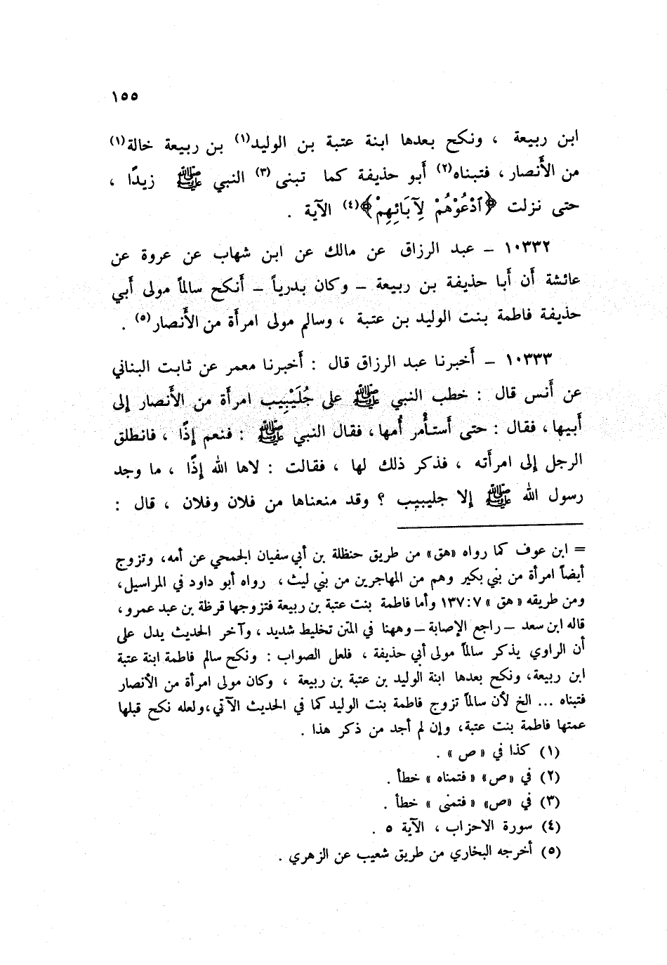 ١٠٣٣٣ - عَبْدُ الرَّزَّاقِ، أَخْبَرَنَا مَعْمَرٌ، عَنْ ثَابِتٍ الْبُنَانِيِّ، عَنْ أَنَسٍ قَالَ: خَطَبَ النَّبِيُّ صَلَّى اللهُ عَلَيْهِ وَسَلَّمَ عَلَى جُلَيْبِيبٍ امْرَأَةً مِنَ الْأَنْصَارِ إِلَى أَبِيهَا، فَقَالَ: حَتَّى أَسْتَأْمِرُ أُمَّهَا، فَقَالَ النَّبِيُّ صَلَّى اللهُ عَلَيْهِ وَسَلَّمَ: «فَنِعْمَ إِذًا»، فَانْطَلَقَ الرَّجُلُ إِلَى امْرَأَتِهِ فَذَكَرَ ذَلِكَ لَهَا، فَقَالَتْ: لَاهَا اللَّهِ إِذًا، مَا وَجَدَ رَسُولُ اللَّهِ صَلَّى اللهُ عَلَيْهِ وَسَلَّمَ إِلَّا جُلَيْبِيبًا، وَقَدْ مَنَعْنَاهَا مِنْ فُلَانٍ وَفُلَانٍ قَالَ ⦗١٥٦⦘: وَالْجَارِيَةُ فِي سِتْرِهَا تَسْمَعُ قَالَ: فَانْطَلَقَ الرَّجُلُ، وَهُوَ يُرِيدُ أَنْ يُخْبِرَ النَّبِيَّ صَلَّى اللهُ عَلَيْهِ وَسَلَّمَ، فَقَالَتِ الْجَارِيَةُ: أَتُرِيدُونَ أَنْ تَرُدُّوا عَلَى رَسُولِ اللَّهِ صَلَّى اللهُ عَلَيْهِ وَسَلَّمَ أَمْرَهُ؟ إِنْ كَانَ قَدْ رَضِيَهُ لَكُمْ فَأَنْكِحُوهُ، فَكَأَنَّهَا جَلَتْ عَنْ أَبَوَيْهَا، وَقَالَتْ: صَدَقْتِ، فَذَهَبَ أَبُوهَا إِلَى رَسُولِ اللَّهِ صَلَّى اللهُ عَلَيْهِ وَسَلَّمَ، فَقَالَ: «إِنْ كُنْتَ قَدْ رَضِيتَهُ فَإِنِّي قَدْ رَضِيتُهُ» قَالَ: فَتَزَوَّجَهَا، ثُمَّ فَزِعَ أَهْلُ الْمَدِينَةِ، فَرَكِبَ جُلَيْبِيبٌ فَوَجَدُوهُ قَدْ قُتِلَ وَوَجَدُوا حَوْلَهُ نَاسًا مِنَ الْمُشْرِكِينَ قَدْ قَتَلَهُمْ، قَالَ أُنِيسٌ: فَلَقَدْ رَأَيْتُهَا وَإِنَّهَا لَأَنْفَقُ بِنْتٍ بِالْمَدِينَةِ "