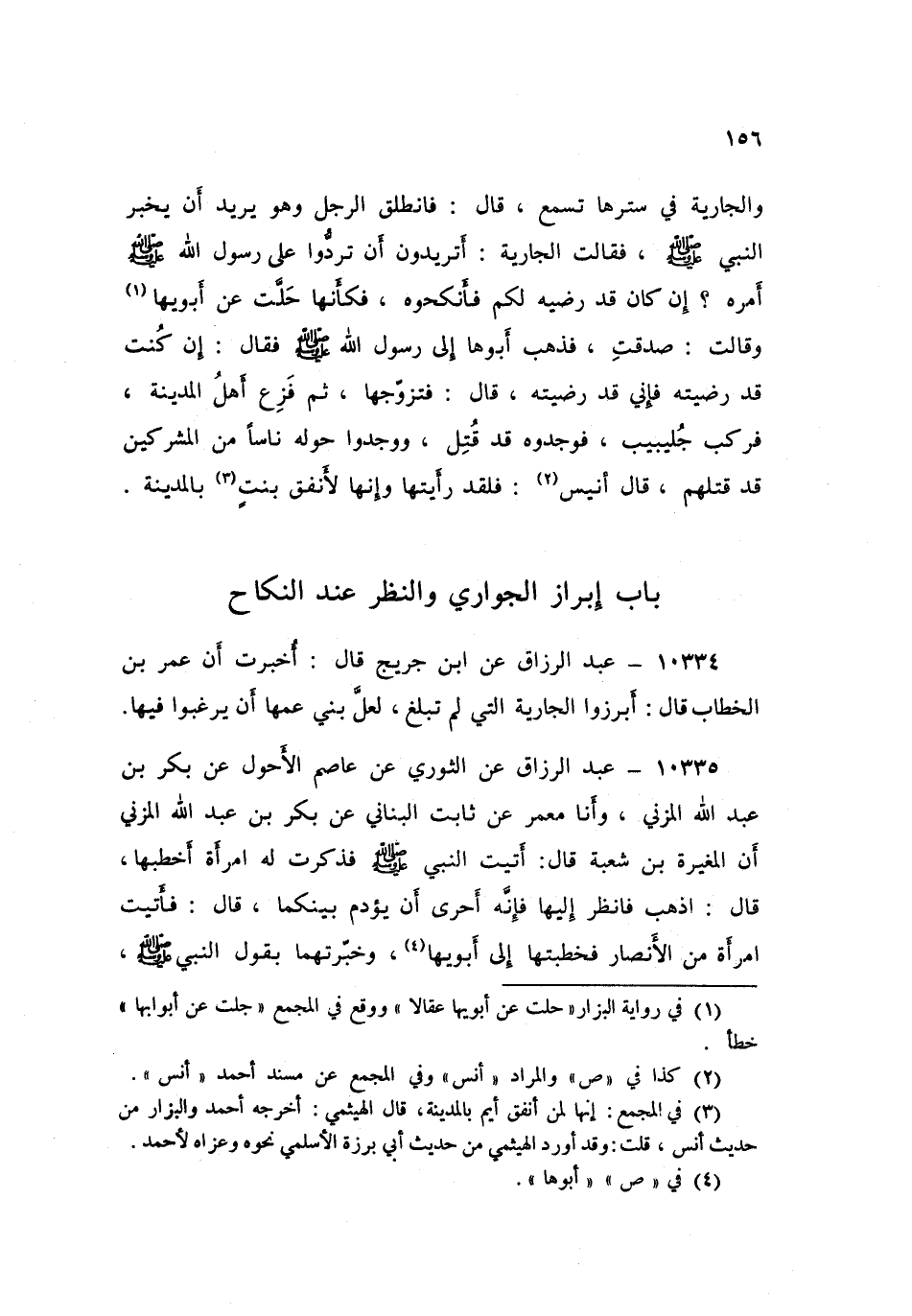 ١٠٣٣٥ - عَنِ الثَّوْرِيِّ، عَنْ عَاصِمٍ الْأَحْوَلِ، عَنْ بَكْرِ بْنِ عَبْدِ اللَّهِ الْمُزَنِيِّ، وَأنا مَعْمَرٌ، عَنْ ثَابِتٍ الْبُنَانِيِّ، عَنْ بَكْرِ بْنِ عَبْدِ اللَّهِ الْمُزَنِيِّ، أَنَّ الْمُغِيرَةَ بْنَ شُعْبَةَ قَالَ: أَتَيْتُ النَّبِيَّ صَلَّى اللهُ عَلَيْهِ وَسَلَّمَ فَذَكَرْتُ لَهُ امْرَأَةً أَخْطُبُهَا قَالَ: «اذْهَبْ فَانْظُرْ إِلَيْهَا، فَإِنَّهُ أَحْرَى أَنْ يُؤْدَمَ بَيْنَكُمَا» قَالَ: فَأَتَيْتُ امْرَأَةً مِنَ الْأَنْصَارِ فَخَطَبْتُهَا إِلَى أَبَوَيْهَا وَخَبَّرْتُهُمَا بِقَوْلِ النَّبِيِّ صَلَّى اللهُ عَلَيْهِ وَسَلَّمَ ⦗١٥٧⦘، فَكَأَنَّمَا كَرِهَا ذَلِكَ، فَسَمِعْتُ تِلْكَ الْمَرْأَةَ وَهِيَ تَقُولُ: إِنْ كَانَ رَسُولُ اللَّهِ صَلَّى اللهُ عَلَيْهِ وَسَلَّمَ أَمَرَكَ بِذَلِكَ أَنْ تَنْظُرَ فَانْظُرْ، وَإِلَّا فَإِنِّي أَنْشُدَكَ، كَأَنَّهَا أَعْظَمَتْ ذَلِكَ قَالَ: فَنَظَرْتُ إِلَيْهَا فَتَزَوَّجْتُهَا، فَذَكَرَ مِنْ مُوافَقَتِهَا